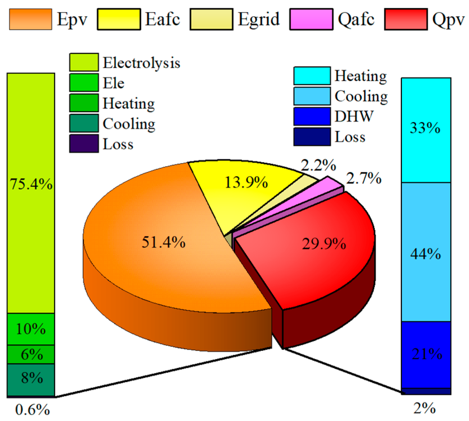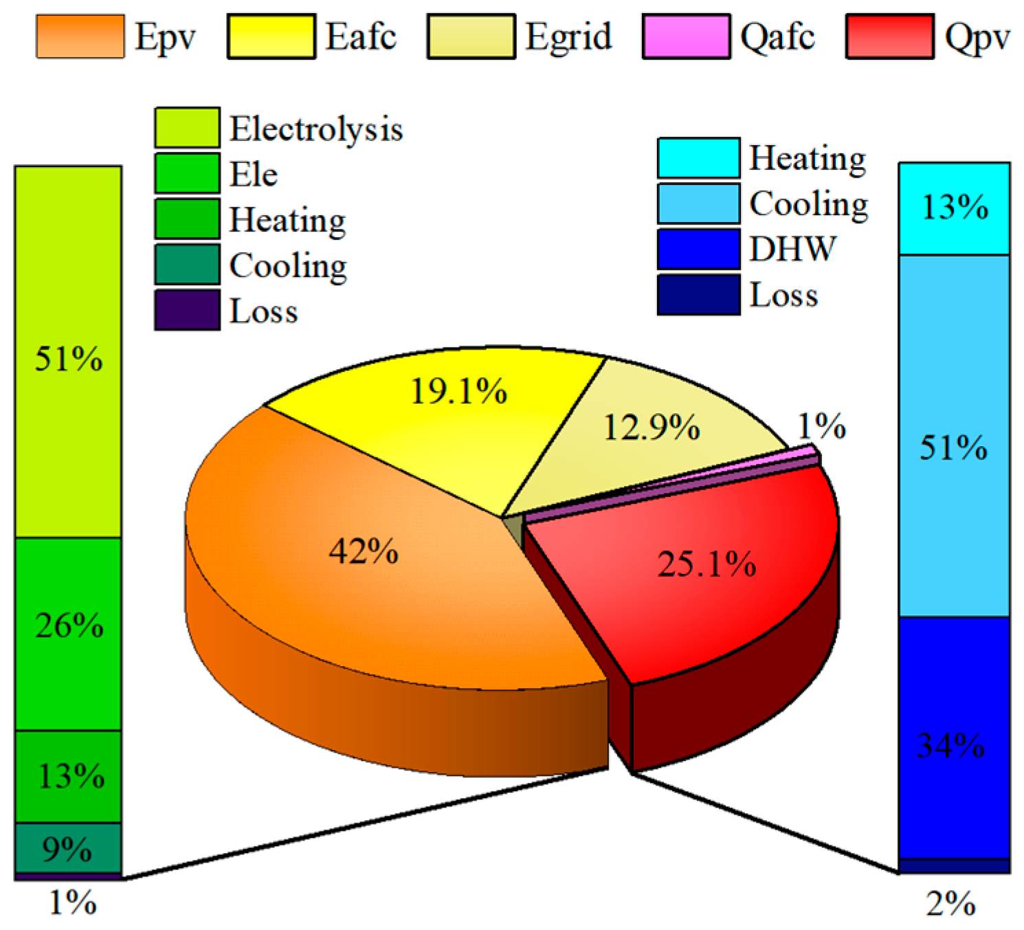 - Compared with the traditional photovoltaic system, the proposed system can realize the storage of electric energy and thermal energy. After meeting the hot water supply needs, the excess heat can be supplied to the absorption chiller and used to preheat water in the electric heating unit, providing a reference for the full-spectrum cascade utilization of solar energy and distributed energy systems in different regions.