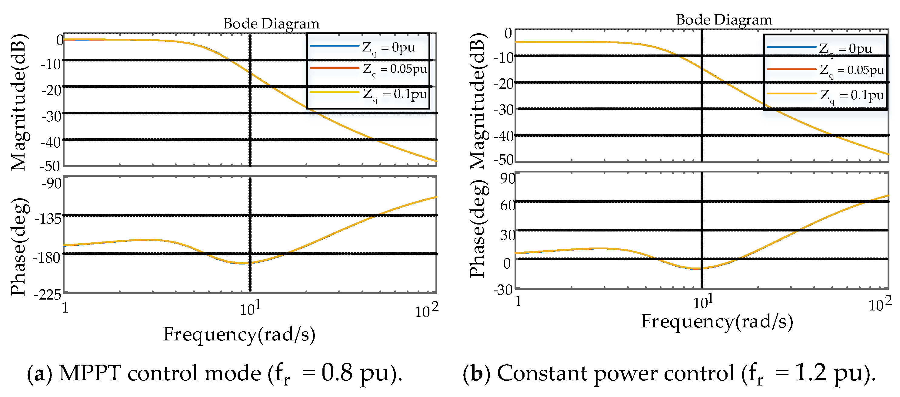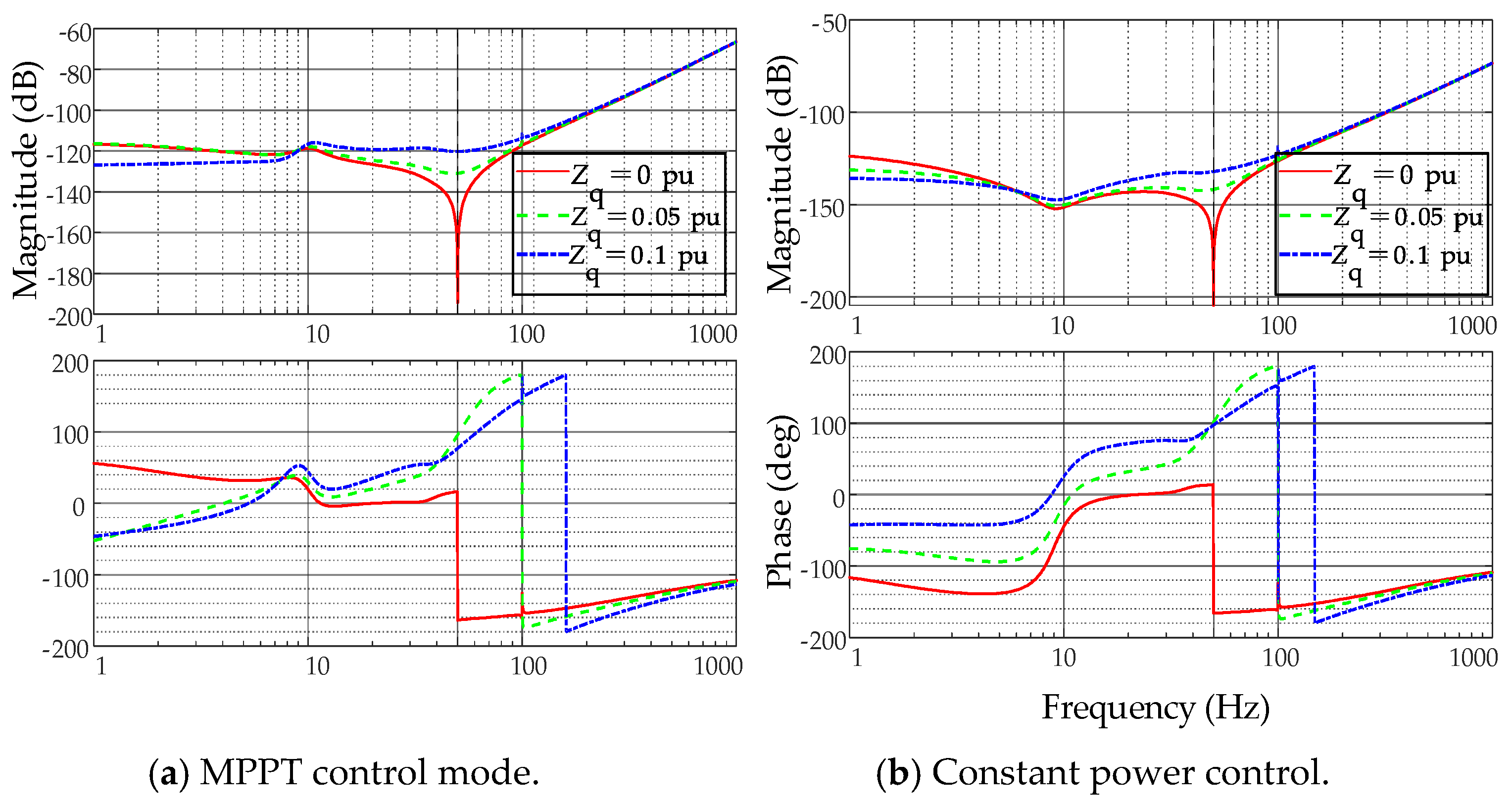- Under MPPT mode, the grid-connected system remains relatively stable despite increases in and . In contrast, under constant power mode, increasing either or exacerbates the degree of negative damping in the grid-connected impedance.