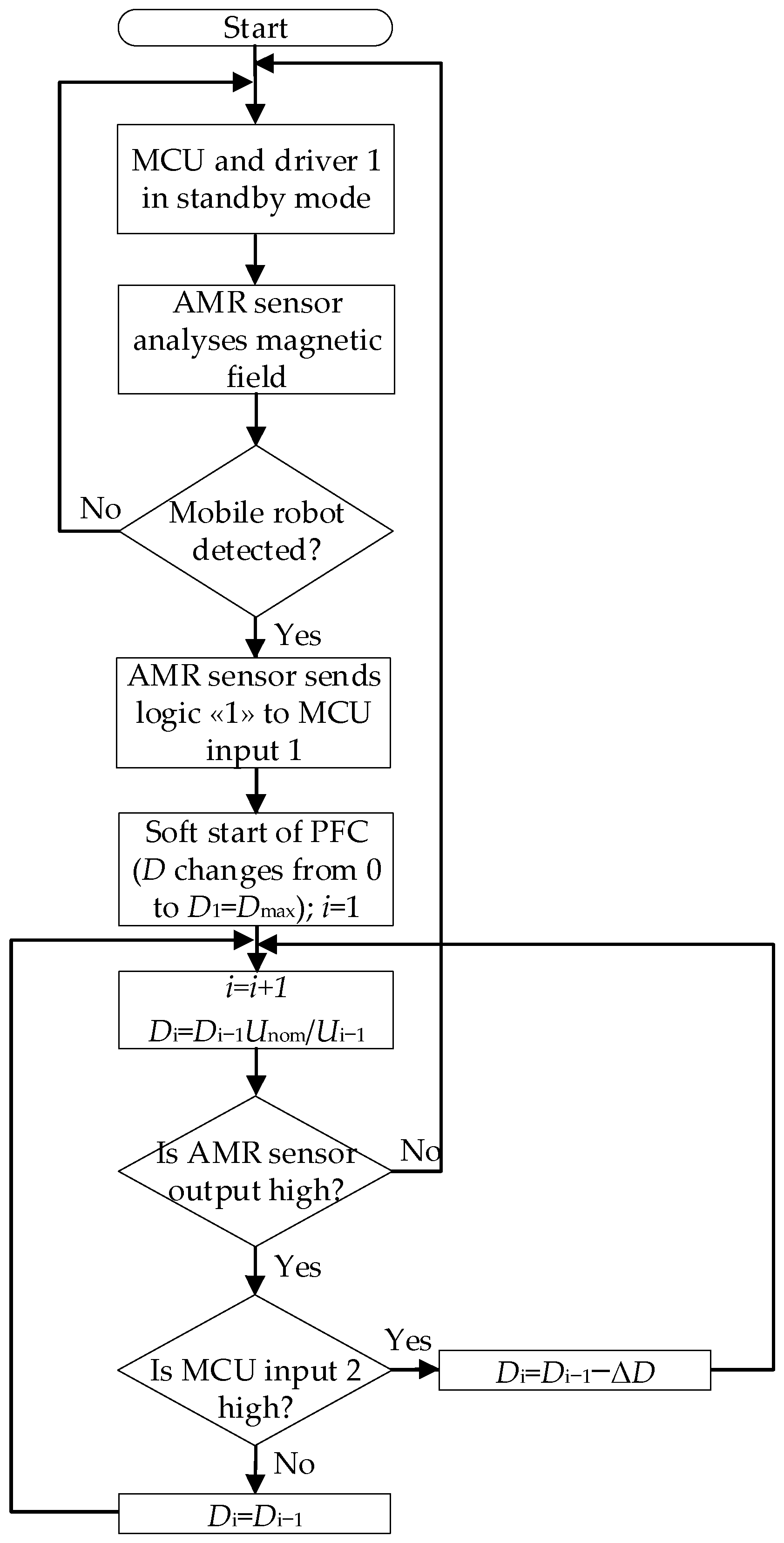 If the PFC input RMS voltage increases, the PFC control-signal duty ratio decreases proportionally (because VLPF increases in (11)); if the input RMS voltage decreases, the duty ratio increases proportionally (because VLPF decreases in (11)). This ensures smooth charging even if the input RMS voltage varies within 230 Vrms ± 10%. When the charging process is finished, the mobile robot drives away from the charging platform, causing the AMR sensor output to go low. Consequently, the PFC driver (driver 1) is disabled, and the integrator is reset.