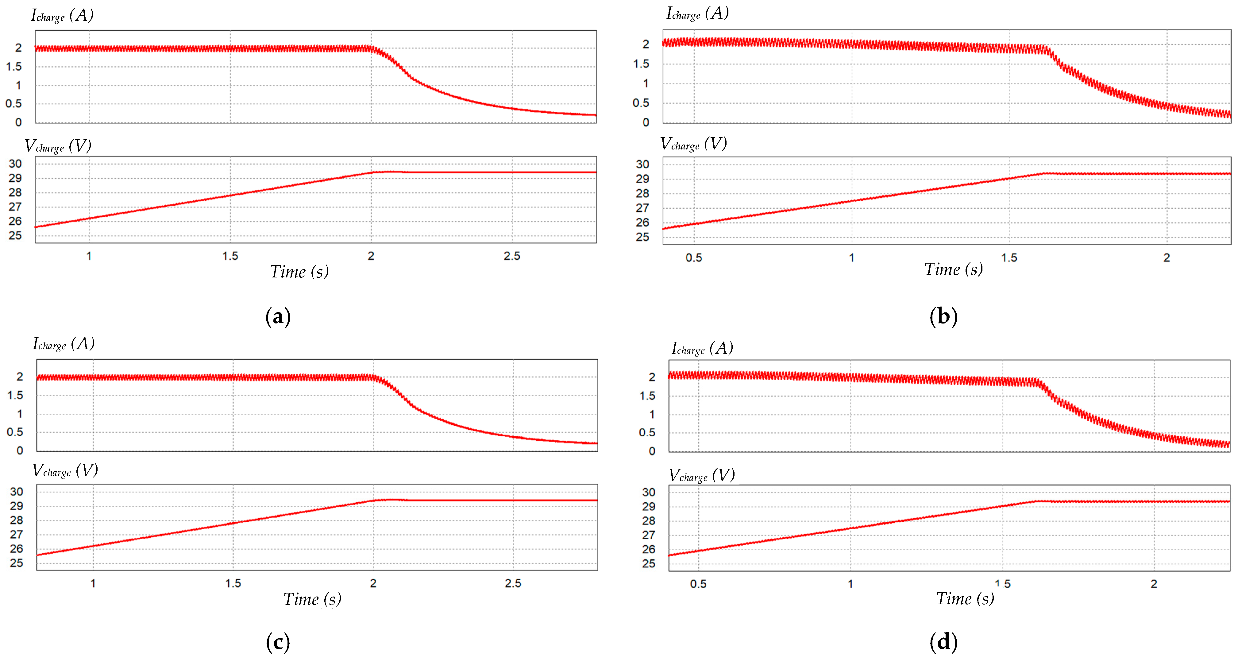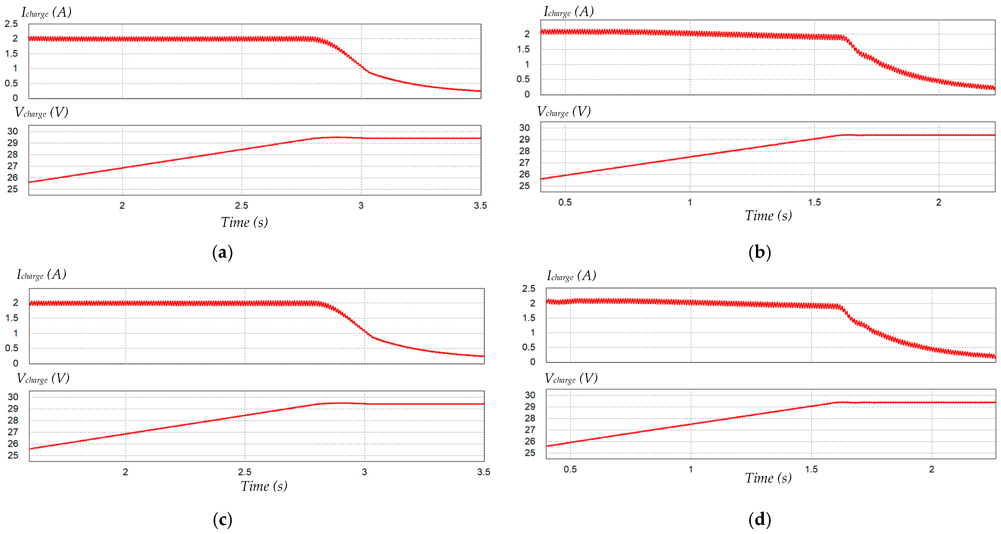 Figure 11) of the wireless charging system with either the conventional or the proposed control clearly show that the system operates correctly, because during the CV phase, the charging voltage remains almost constant, and during the CC phase, the charging current remains almost constant, despite variations in