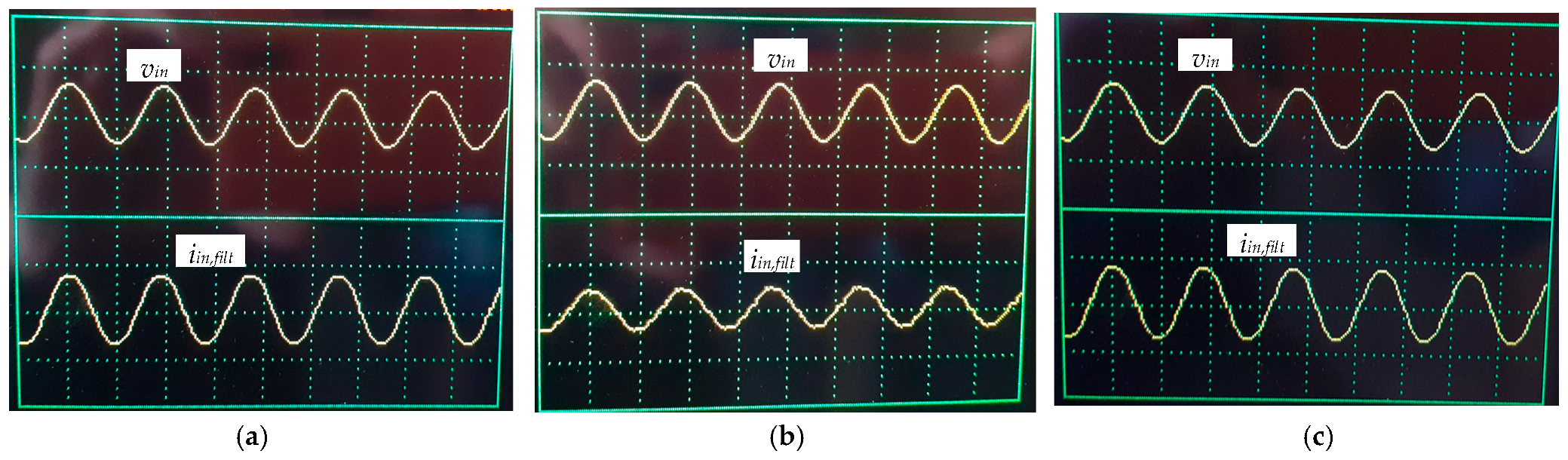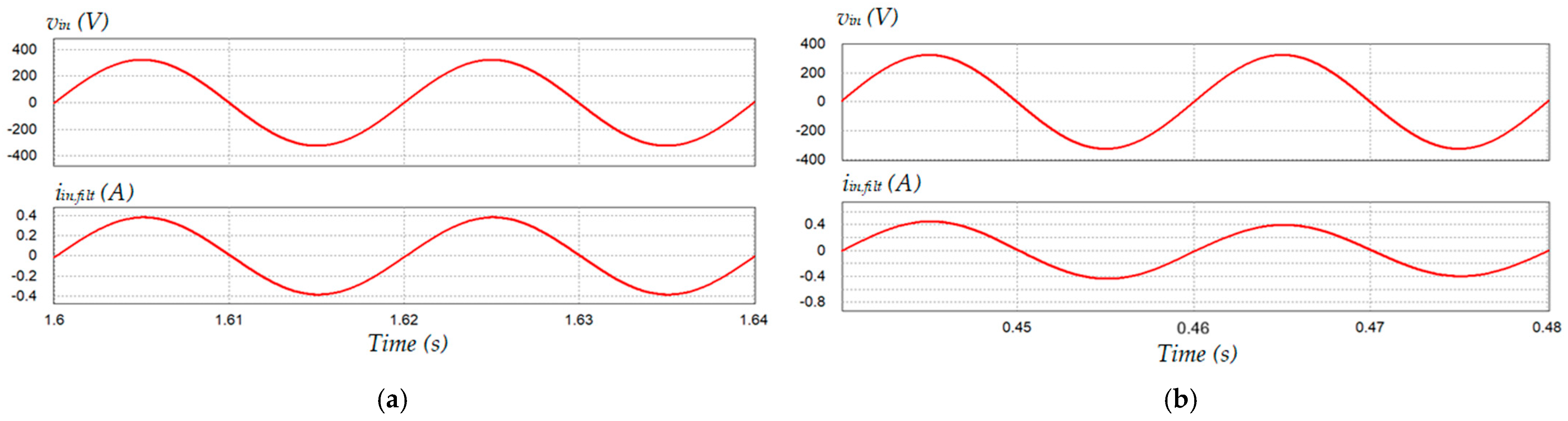 Table 3, the PFC stage of the wireless charging system with the proposed control performs well: the input filtered current is in phase with the AC grid voltage, the THDI is low, and the PF is nearly unity. For both control strategies, the PF remains the same for different values of