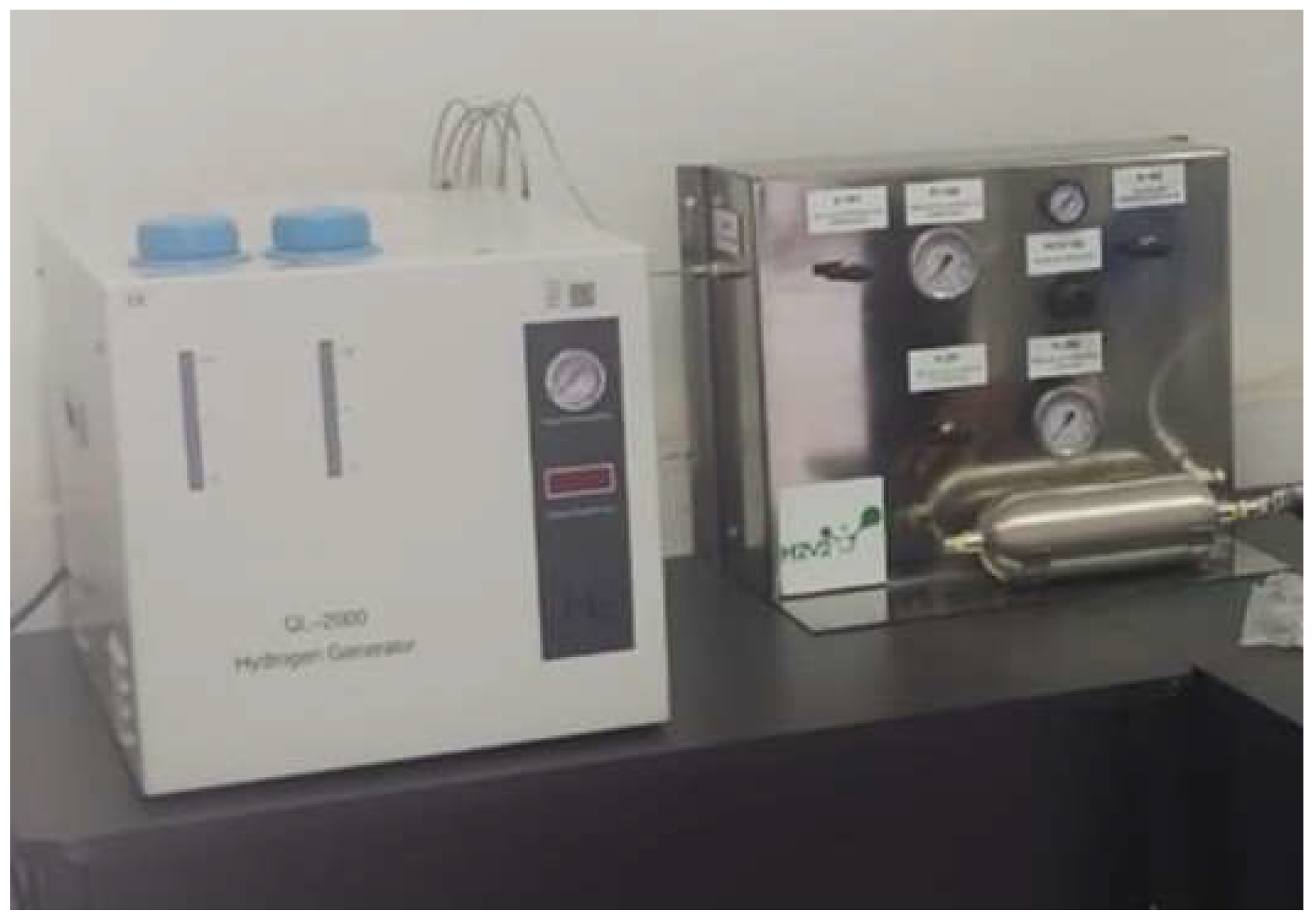 The PEM electrolyzer used in this experimental research is found in the QL-2000 Hydrogen Generator from Saikesaisi Hydrogen Energy Co., Ltd. (Jinan, China). The hydrogen generator is depicted in