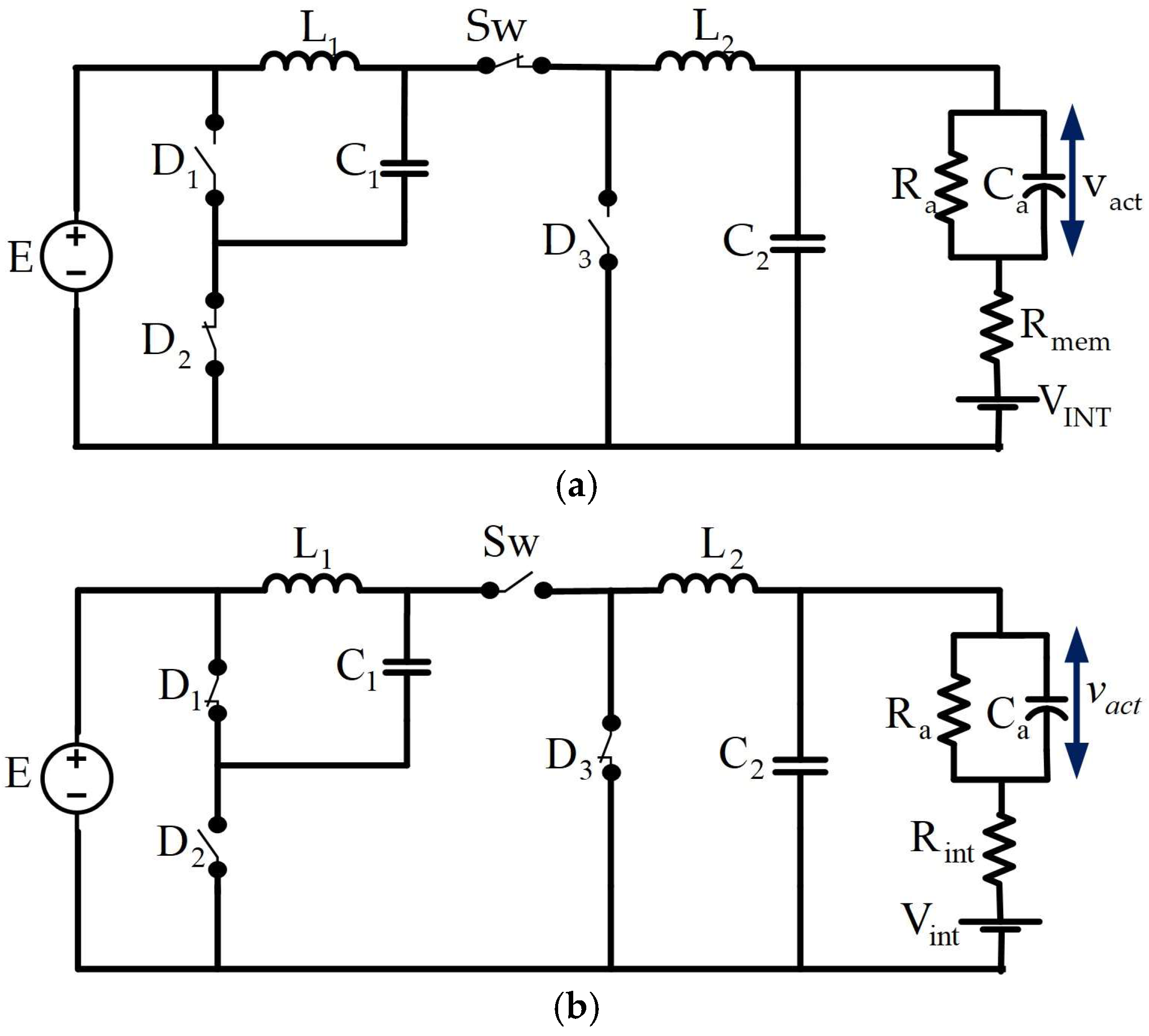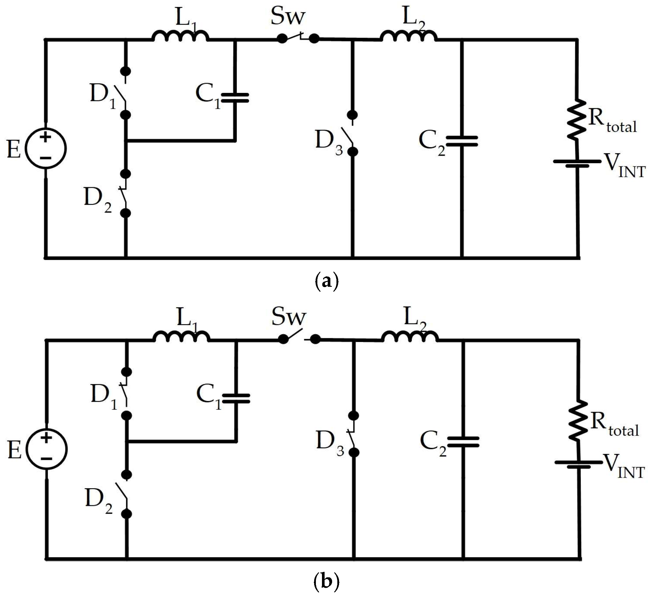 . Initially, the switched state-space model was obtained by applying Kirchhoff’s voltage and current laws to the electrical paths that result when the converter’s active switch is ON and OFF, as shown in