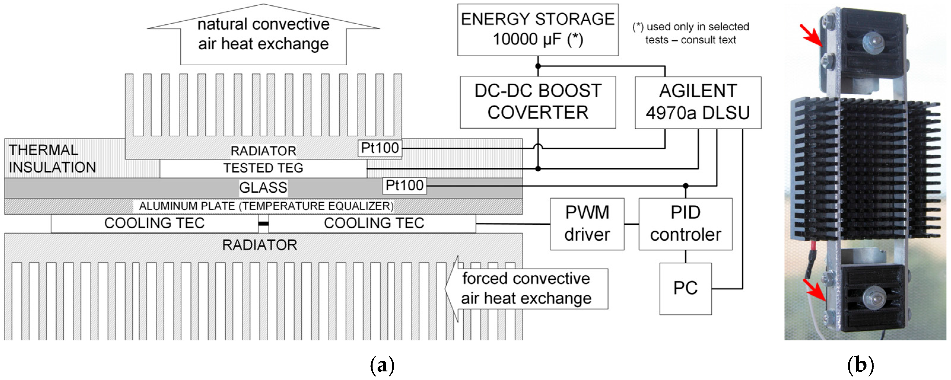Figure 1a. The temperature of the other elements was also monitored using miniature class A Pt100 RTD sensors routed together with other voltage signals to Agilent 34970a DLSU (Agilent, Santa Clara, CA, USA) controlled by a PC running a control application written in Keysight VEE Pro 9.33 visual engineering environment software (Keysight Technologies, Santa Rosa, CA, USA). The DLSU provided a 0.01 °C resolution of temperature readings and the overall accuracy of ±0.2 °C. All voltage-current characteristics were obtained by using a Keithley 6430 SMU (Tektronix Inc., Beaverton, OR, USA), which was also used for power measurements. The accuracy of the voltage, current and power measurements was in accordance with the catalog parameters of the listed measuring devices.