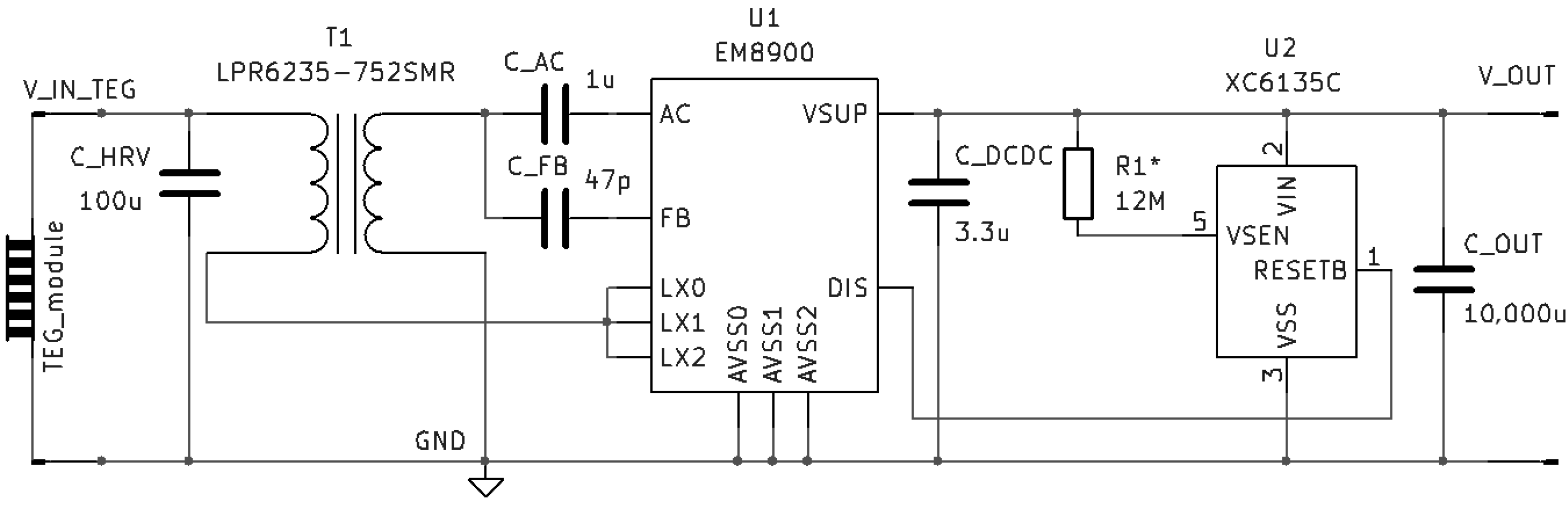 COUT = 10,000 μF, was also used as a CES. As the EM8900 boost converter is not fitted with the integrated output voltage control, to limit and stabilize its output voltage, a simple hysteretic approach was applied using the EM8900 DIS input. When DIS pin is high, EM8900 shuts down and it stops transferring power from its AC input to the VSUP output, and when DIS is low, EM8900 is running. A ULP comparator (XC6156C31, Torex Semiconductor Ltd., Tokyo, Japan) with a fixed 3.1 V threshold voltage was selected as a hysteretic voltage supervisory sub-circuit [
