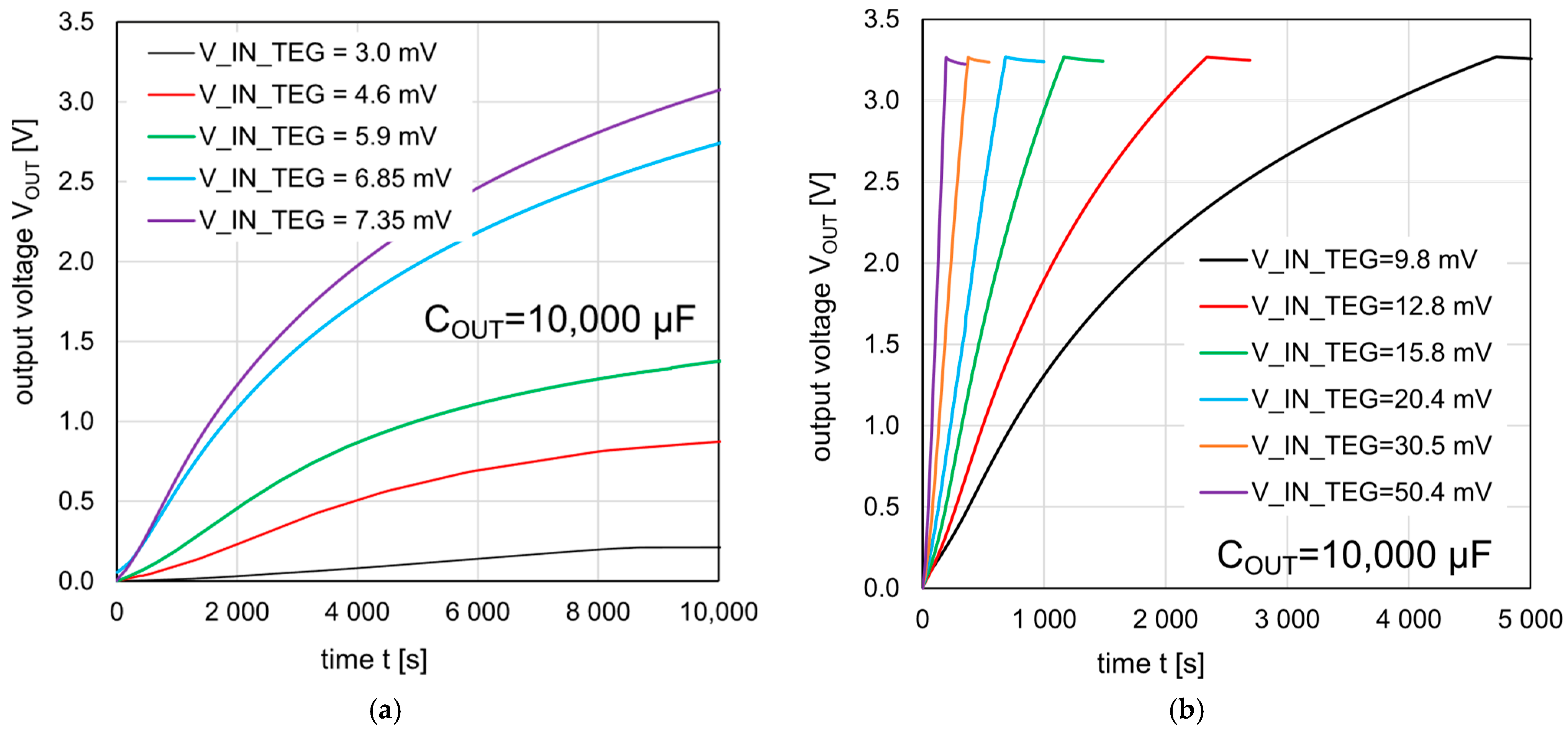 COUT = 10,000 μF CES. For the average indoor temperature of 21.5 °C (i.e., the temperature of the indoor thermal comfort) and the temperature of the simulated windowpane glass of just 19.6 °C, a temperature difference between the “warm” and “cold” side of the thermopile was close to 0.95 °C. This produced the TEG open-circuit output voltage of 14.5 mV, which dropped to approximately 10 mV after loading the TEG with the boost converter-CES assembly. In such laboratory conditions, reflecting the operation of the proposed thermoelectric harvester in a real environment, the converter loaded with
