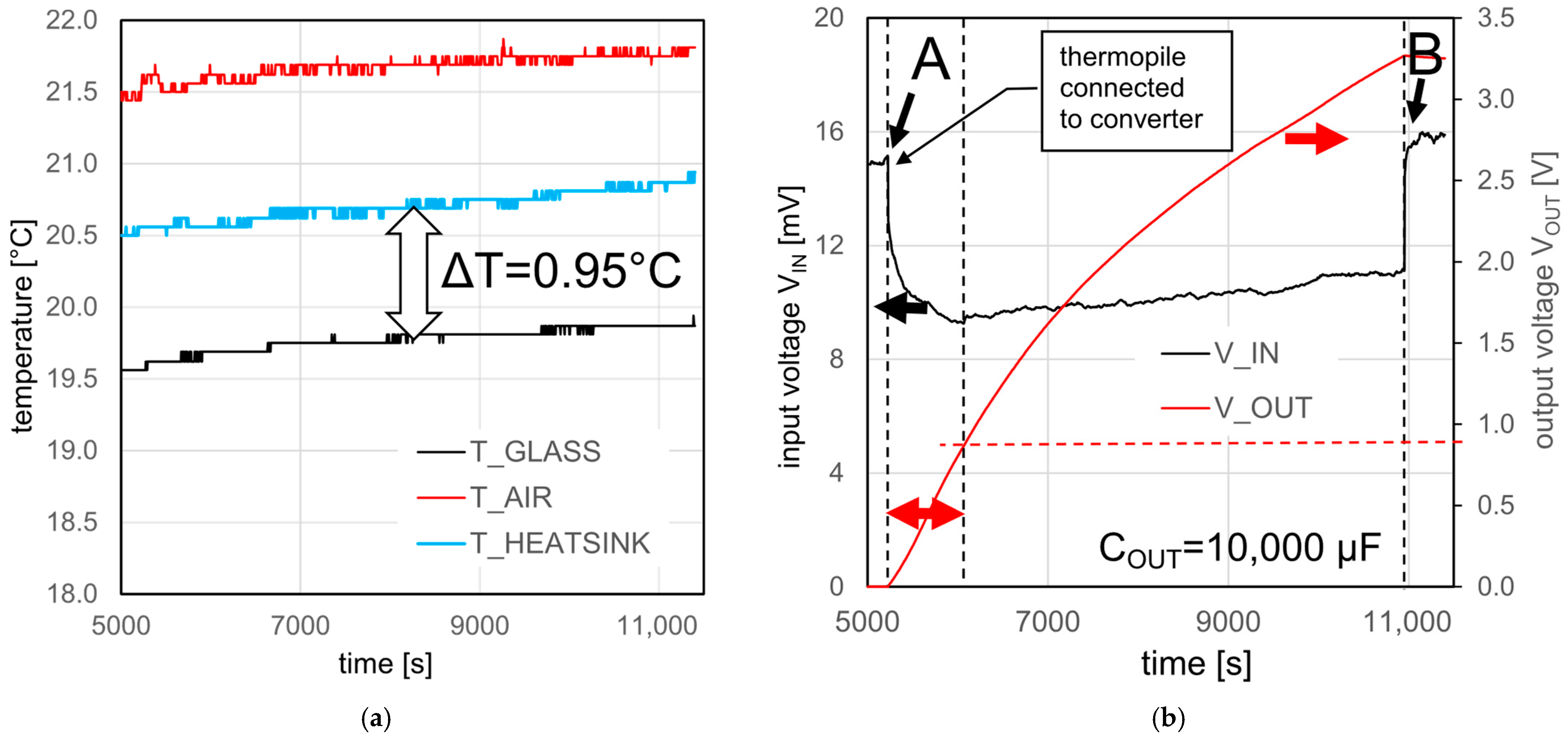 Figure 6a, i.e., during a very slow increase in temperature of both the simulated window glass and the temperature of the indoor air and the heat sink (0.4 °C during 96 min, i.e., 0.25 °C/h), the temperature difference between the glass and the heat sink remained practically constant (ΔT~1 °C). On the other hand, the open-circuit voltage of the TEG was increased by approx. 0.3 mV (i.e., by approx. 0.75 mV/°C) from the moment the boost converter was switched on until the maximum voltage at its output was reached (i.e., during 96 min between the moments marked A and B in