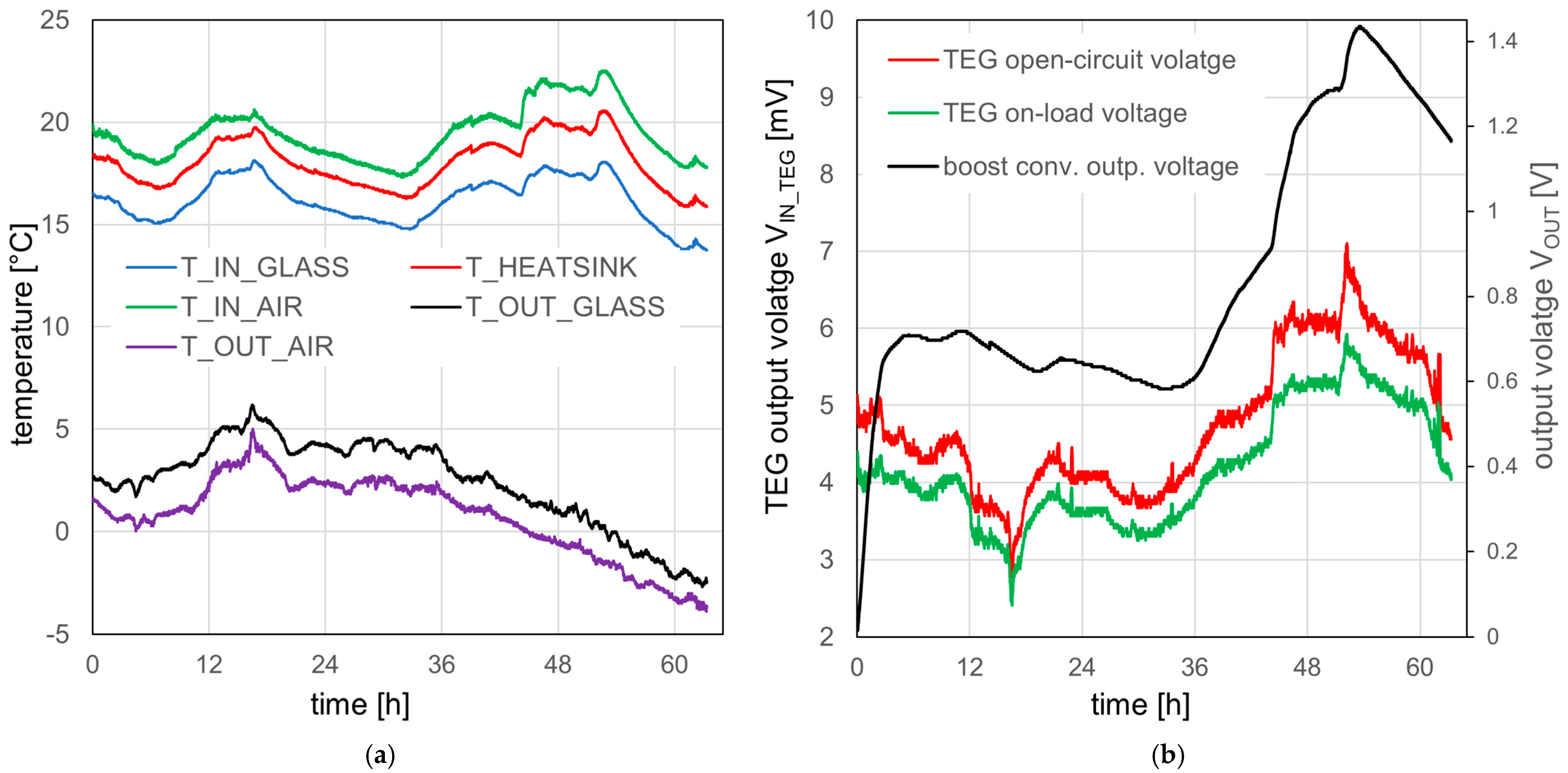 Figure 7b), equal to 1.43 V, was obtained at an outdoor air temperature of −1.6 °C. In such conditions, the indoor air temperature of 22.0 °C resulted in the temperature of the glass on the indoor side of the window being equal to 17.7 °C and the temperature of the heat sink being 20.1 °C. At the maximal temperature difference of 2.5 °C between the “warm” and “cold” side of the TEG, its open-circuit output voltage of 7.1 mV and 5.9 mV when it was loaded with the boost converter-CES assembly was recorded. It was found that the OP of the TEG obtained in the real field conditions generally varied between 84 and 90%. The achieved