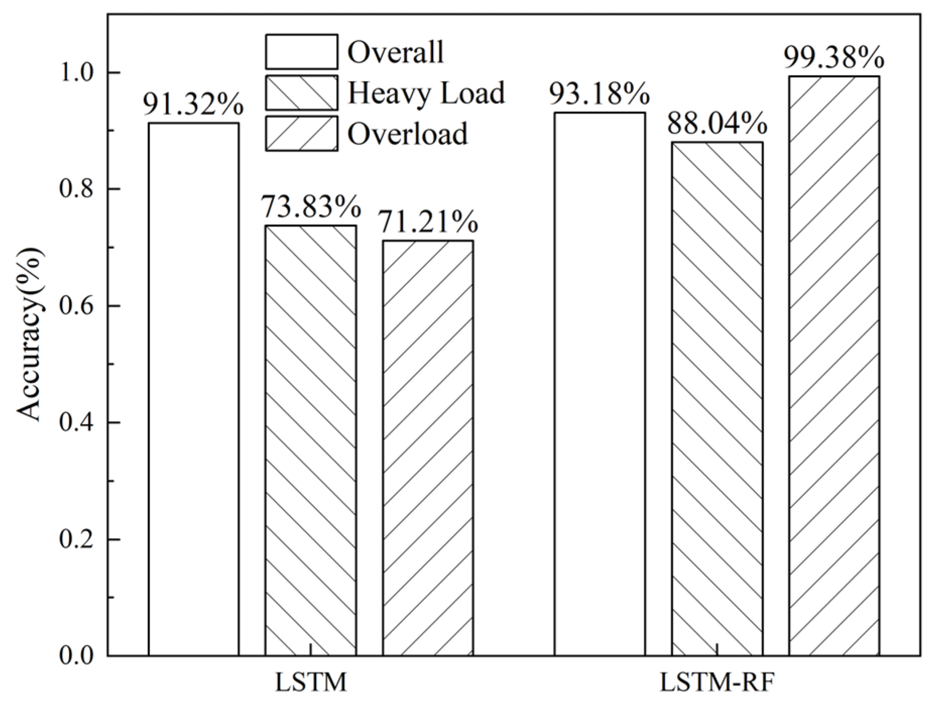 Figure 4 further compares the classification accuracy of the proposed model and a standard LSTM model. The comparison between the two methods shows clear gains in all key metrics. The improved algorithm raises overall classification accuracy by 1.86%, increases heavy load state recognition accuracy by 14.21%, and improves overload state recognition accuracy by 28.17%. These improvements strengthen the reliability of equipment state assessment in real operations.