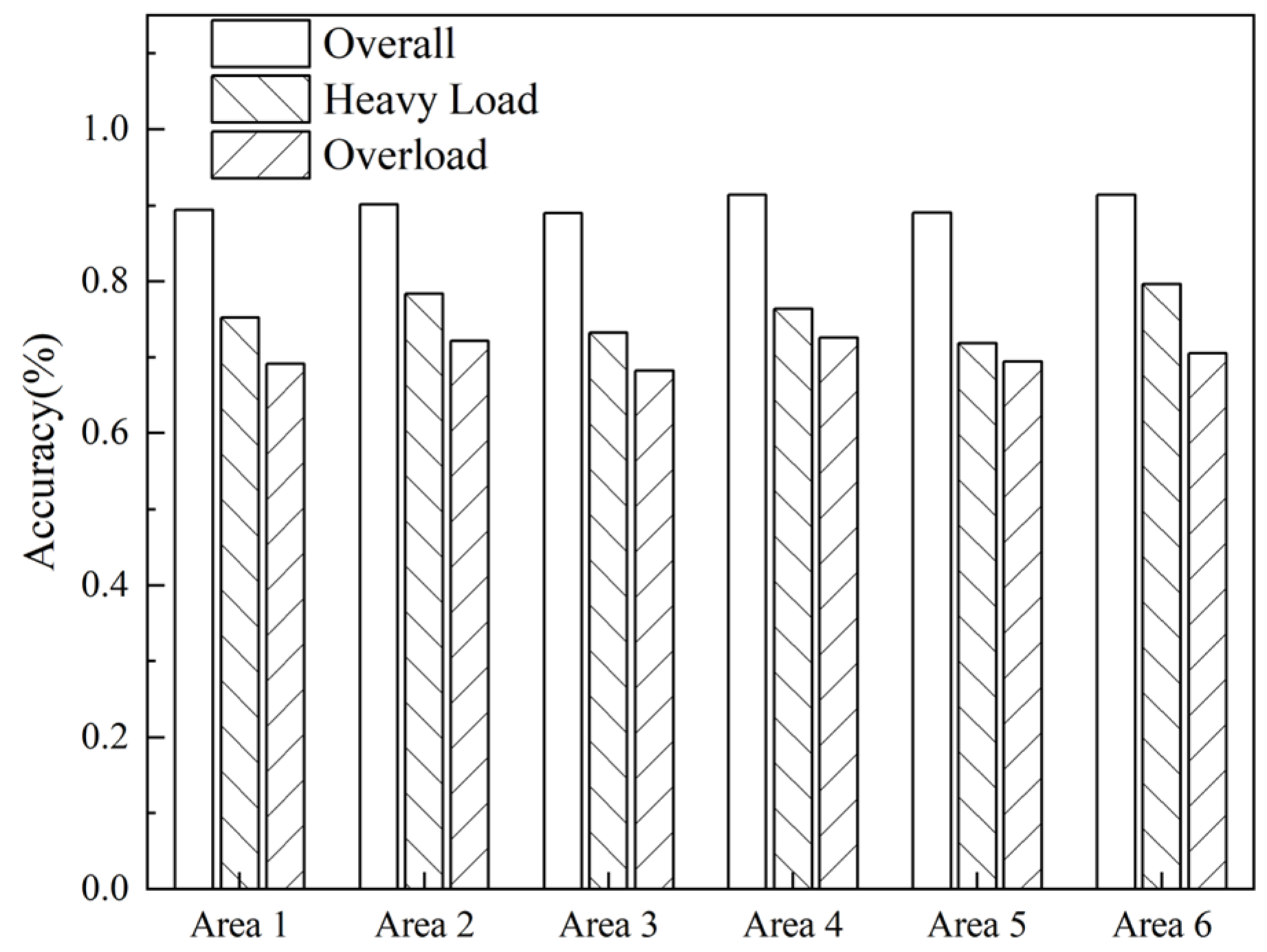 Table 5 reports the accuracy, recall, and F1 score. The overall accuracy reaches 93.18%, which confirms strong state identification under normal operating conditions. The model maintains high prediction accuracy for all load states. The F1 score further shows balanced performance across categories. These results confirm that the model provides a strong and reliable assessment of heavy overload risk in distribution transformers.