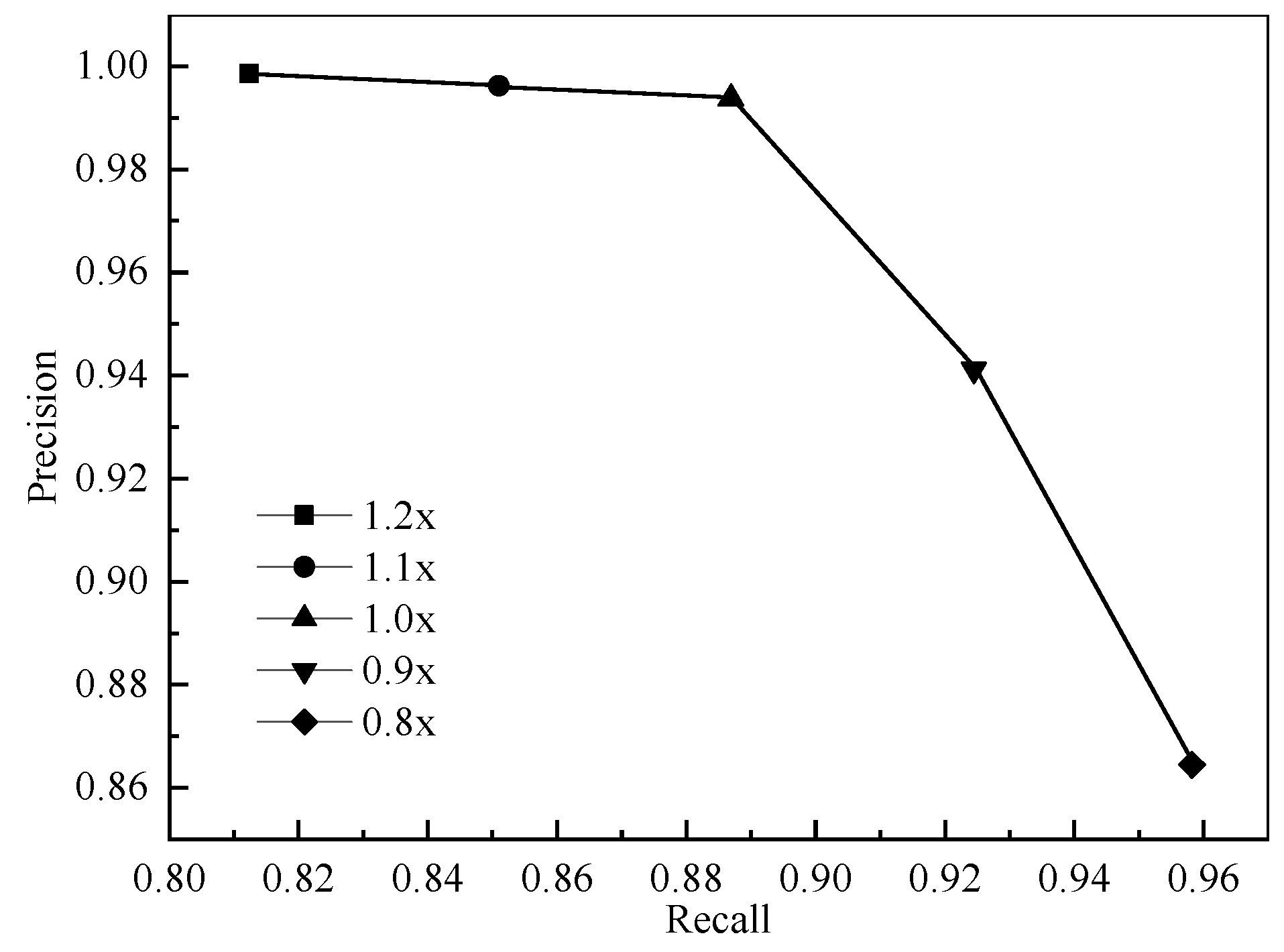 Figure 6. The results indicate that the default threshold is positioned at the ‘elbow’ of the curve, yielding an optimal balance between precision and recall. Beyond this point, further increasing the recall leads to a rapid decline in precision to 0.8645, which increases false alarms. Conversely, moving to a 1.2× threshold significantly reduces the capture of latent risks.