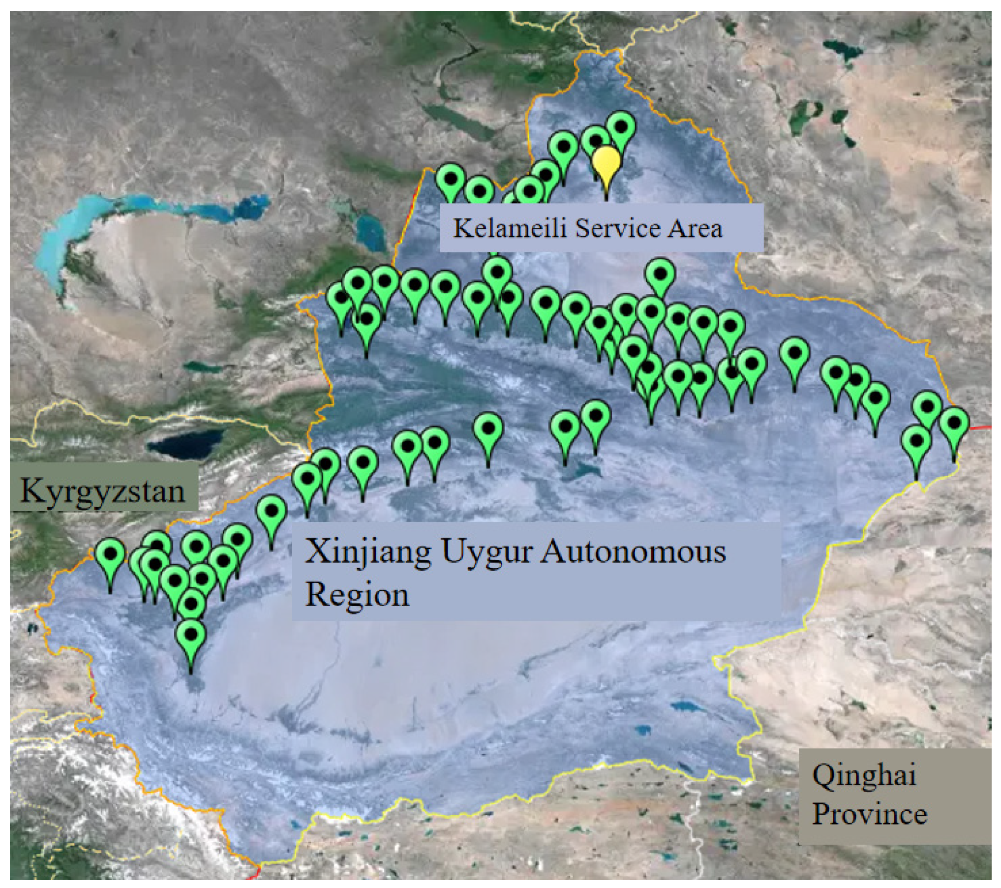 2], and the number of supporting service areas was about 7500. The energy consumption and low-carbon transformation of these areas have become the focus of attention. According to the data of the Department of Transportation of Xinjiang Uygur Autonomous Region, the current mileage of highways in Xinjiang exceeds 7700 km, and the number of service areas exceeds 73 pairs. The distribution of some expressway service areas in Xinjiang is shown in