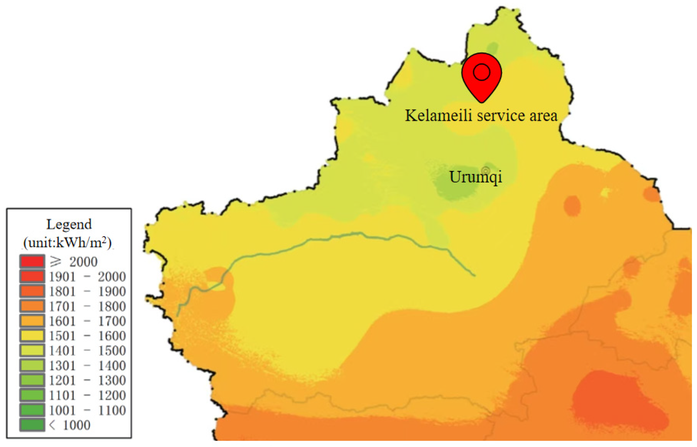 Figure 2 shows the distribution map of annual total horizontal solar irradiance in Xinjiang in 2024. This distribution map clearly demonstrates the regional endowment characteristics of solar energy resources in Xinjiang, providing an intuitive spatial reference for the zonal development of solar energy resources, site selection of photovoltaic projects, and regional energy planning in Xinjiang. Based on the above, this paper selects the Kelameili Service Area, located in the middle section of the S21 Expressway—the first desert highway in Xinjiang—as the research object. The region where the service area is located is characterized by long and severe cold winters, hot and dry summers, sufficient sunshine duration, and strong solar radiation intensity. The solar energy guarantee rate ranges from 50% to 60%, and the region is classified as a Class II solar-rich area [