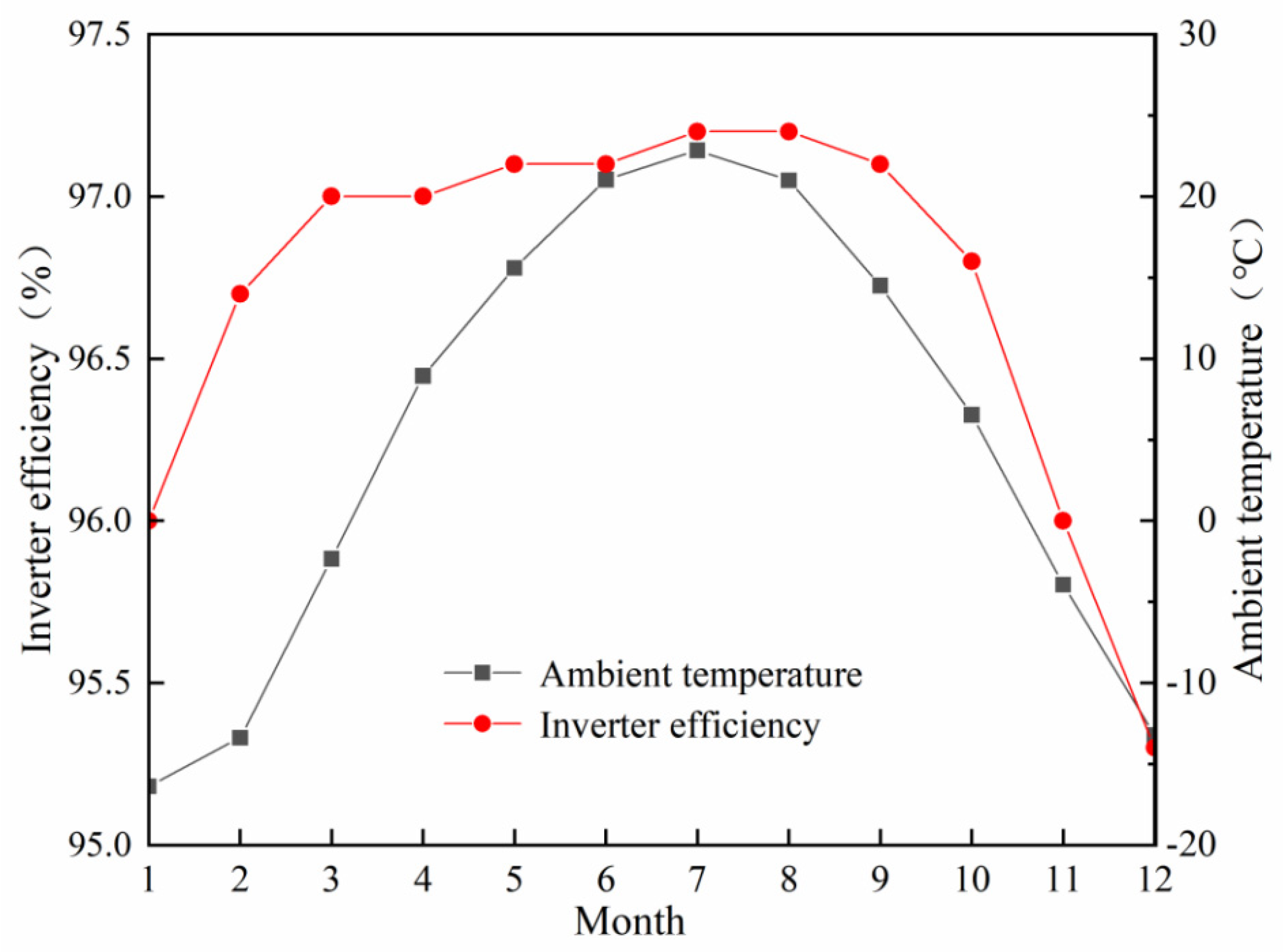 Figure 15). Although the power generation of the photovoltaic system peaked in July, the inverter efficiency in this month was slightly lower than that in August, mainly due to the higher temperature in July than in August, and the high-temperature environment had a certain negative impact on the inverter efficiency. The annual simulation data show that the efficiency of the inverter is always maintained at more than 95%.