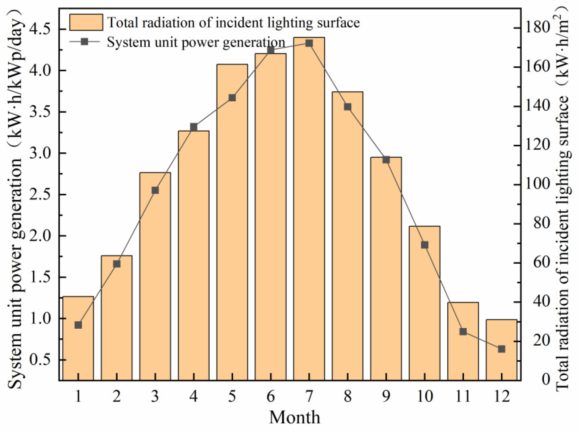 Figure 16 shows the corresponding relationship between the total radiation of the lighting surface of the photovoltaic power generation system and the unit power generation of the system. It can be seen that the unit power generation of the system is significantly positively correlated with the total radiation received by the lighting surface. In July, the total radiation reached the highest value, and the corresponding system unit power generation also reached the peak. In December, the total radiation is the lowest, and the unit power generation of the system is correspondingly reduced to the lowest level.