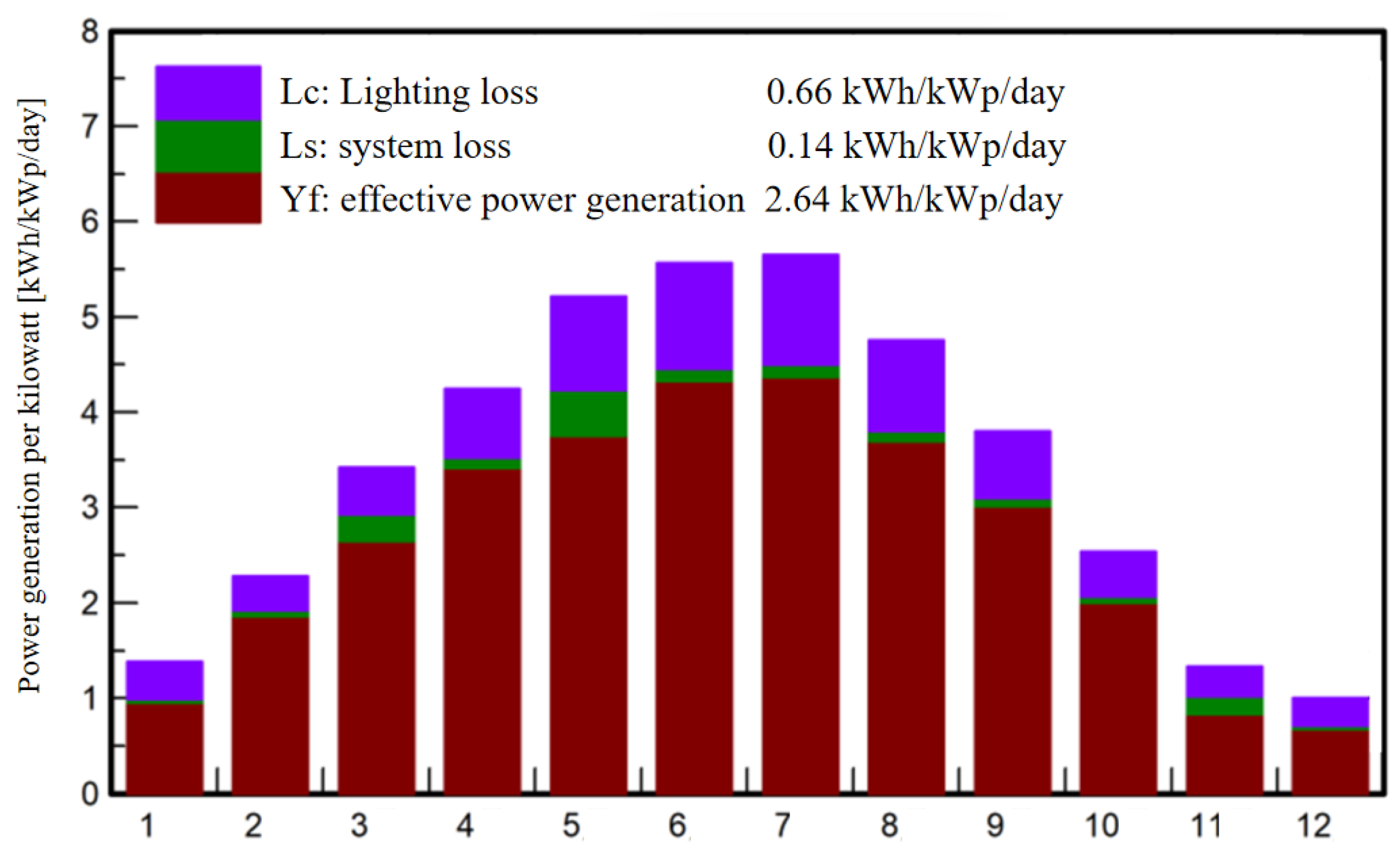 Table 5 further shows that the system’s unit power generation loss peaked in May at 0.57 kWh/kWp/day; the losses were the smallest in January and December, 0.07 kWh/kWp/day and 0.08 kWh/kWp/day, respectively.
