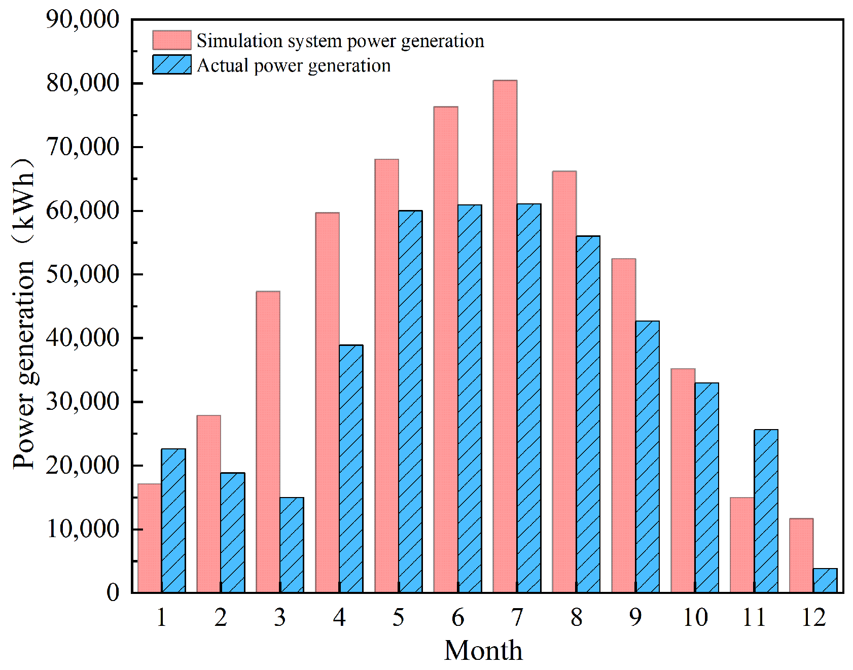In November and January, the simulated power generation is lower than the actual measured value because the historical or predicted irradiation conditions used in the simulation are more conservative, and the actual illumination in these two months is better than expected, resulting in the actual power generation being higher than the simulated value.