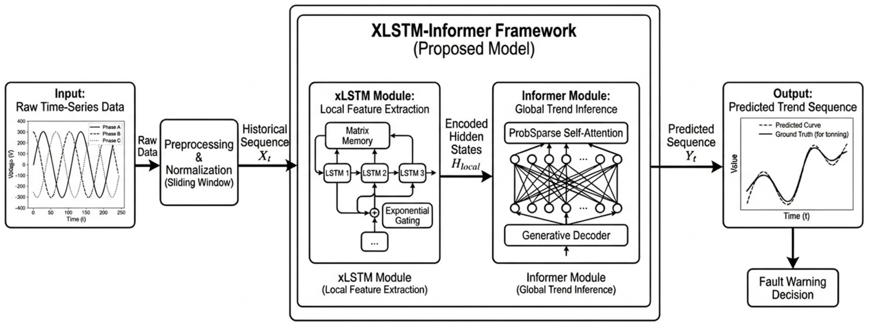 In summary, existing methods for distribution network fault prediction face a fundamental trade-off, which is the difficulty in capturing instantaneous abrupt changes while simultaneously accounting for long-term evolutionary trends. Standalone LSTM struggles to maintain long-term memory, whereas standard Transformers tend to overlook critical local details. To address this challenge, this paper proposes a hybrid prediction model that integrates Extended LSTM (XLSTM) with Informer, termed XLSTM-Informer. The model consists of two key components: (1) an XLSTM-based local feature encoder that leverages improved exponential gating and matrix memory structures to specifically capture high-frequency, transient fault precursors; (2) an Informer-based global decoder that employs the ProbSparse sparse self-attention mechanism to efficiently infer long-term fault evolution trends. Using real operational data from a regional distribution network, this study particularly evaluates the model’s performance under typical extreme scenarios, including summer peak loads and winter heating spikes, with the aim of providing a high-precision, robust solution for proactive defense of active distribution networks under complex operating conditions.