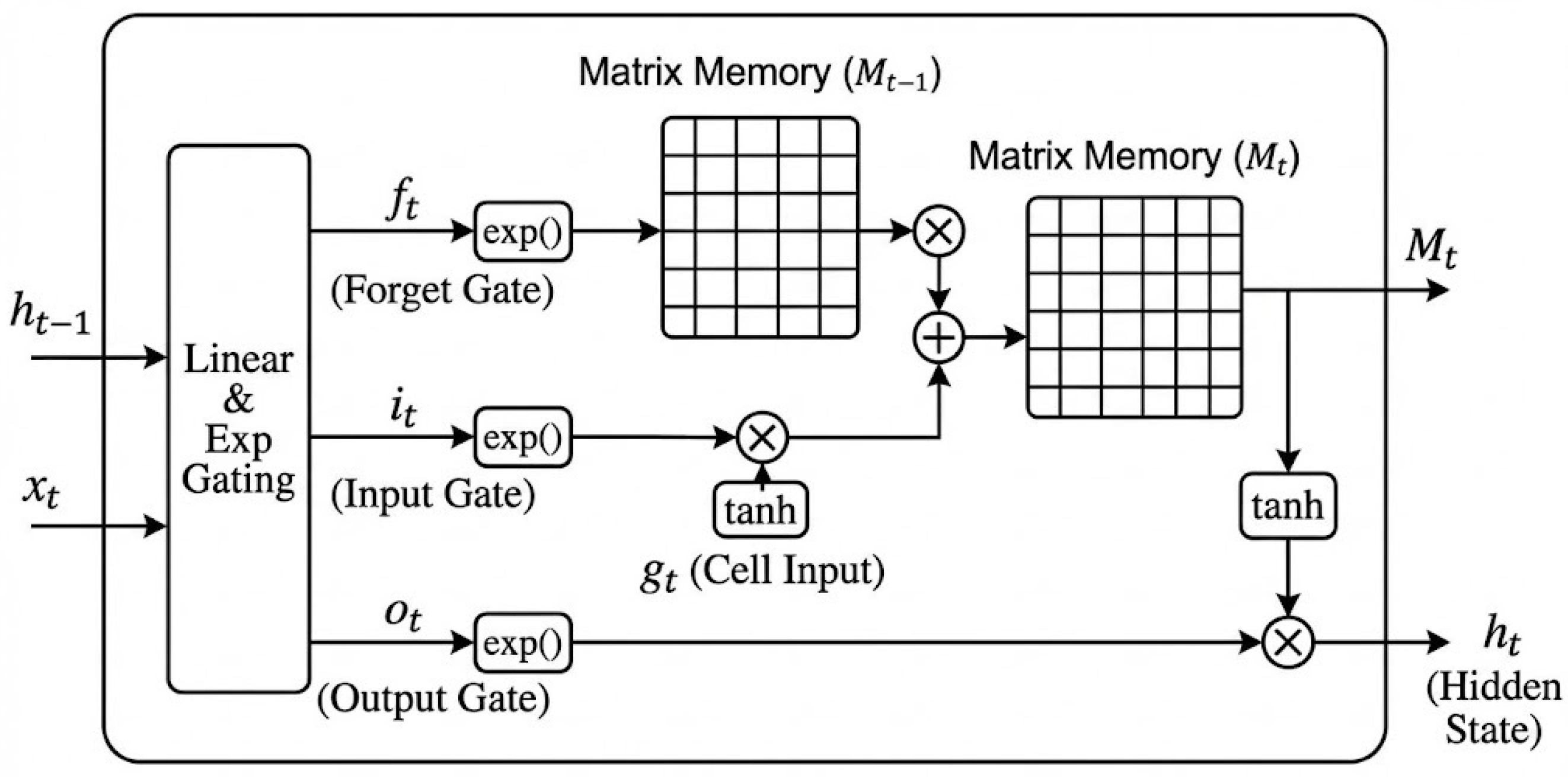 Matrix Memory: The scalar cell state (ct) is expanded into matrix structures. This significantly increases the memory capacity, ensuring that critical local features are preserved even before entering the global attention module.