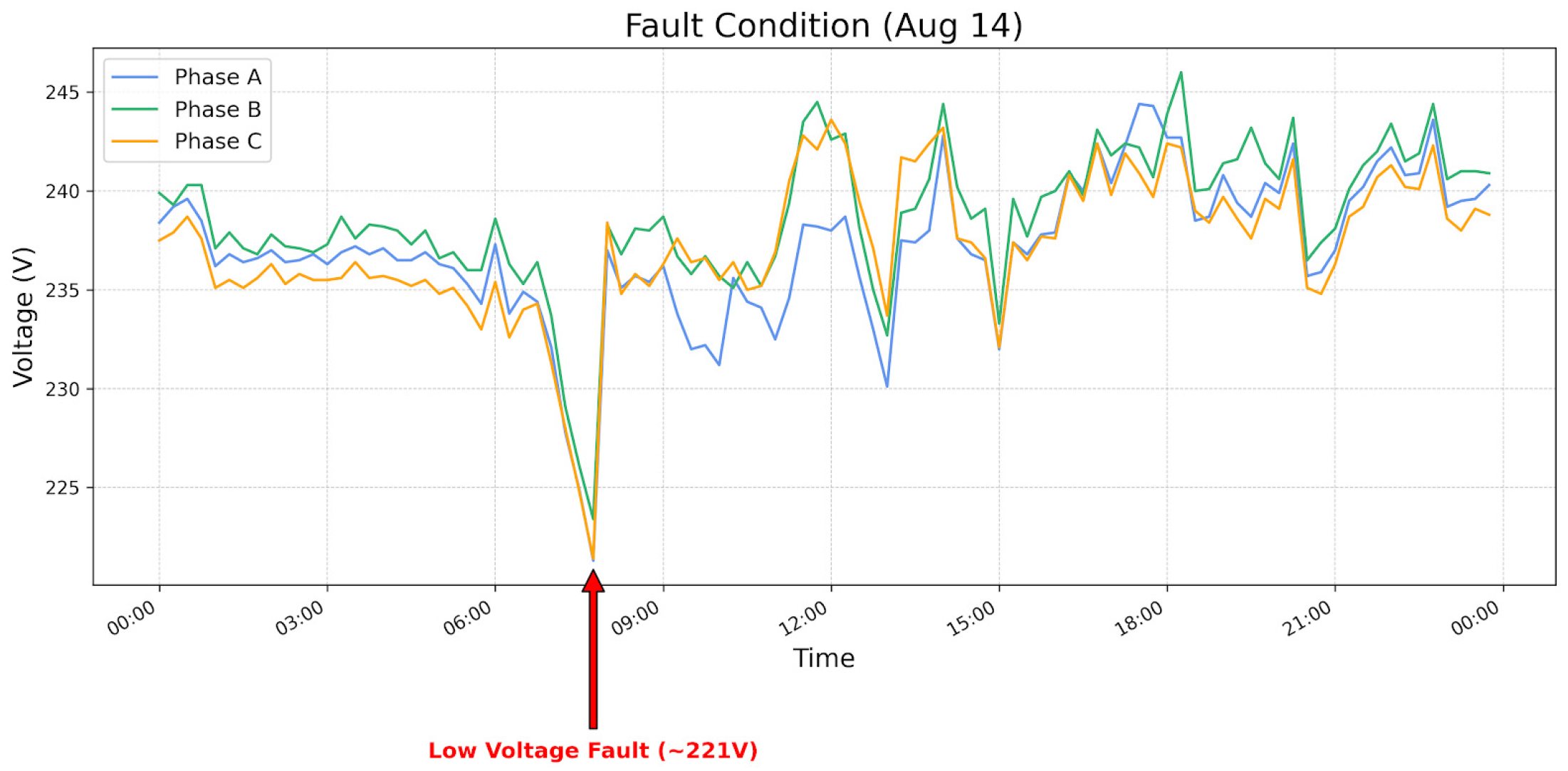 Figure 4 presents the typical normal operating waveform of the distribution area. As observed, although the voltage is maintained at a high level of approximately 240 V, the curve remains smooth with no abrupt changes. In contrast,