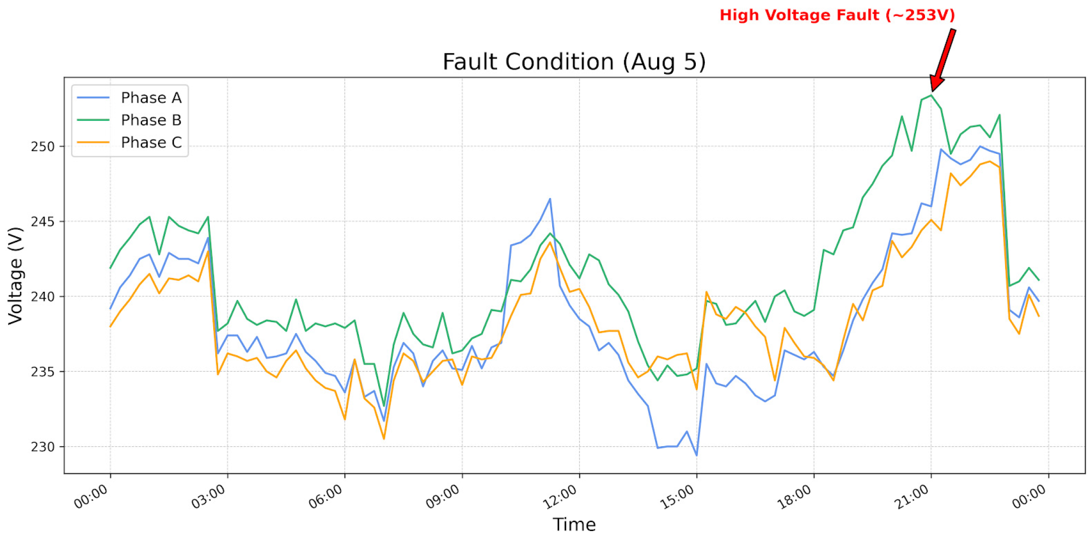 Figure 6 depicts an abnormal voltage rise to 250 V, exhibiting a dangerous overvoltage trend. The model proposed in this paper aims to precisely distinguish the normal high voltage in