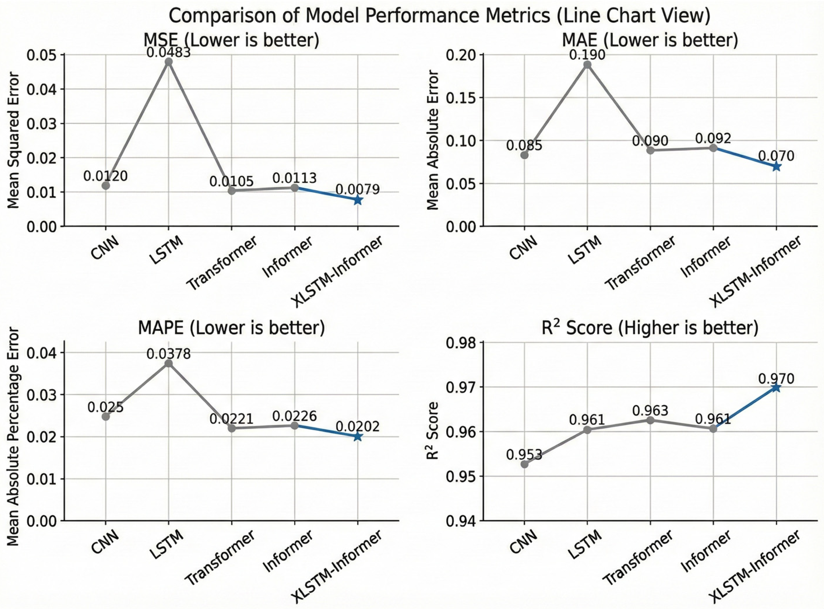 To rigorously evaluate the general trend prediction capability of the proposed model, we conducted a comprehensive benchmark on the complete test dataset. The XLSTM-Informer was compared against mainstream deep learning baselines (CNN, LSTM) as well as state-of-the-art transformer variants, including Autoformer, FEDformer, and the original Informer. The quantitative results are presented in