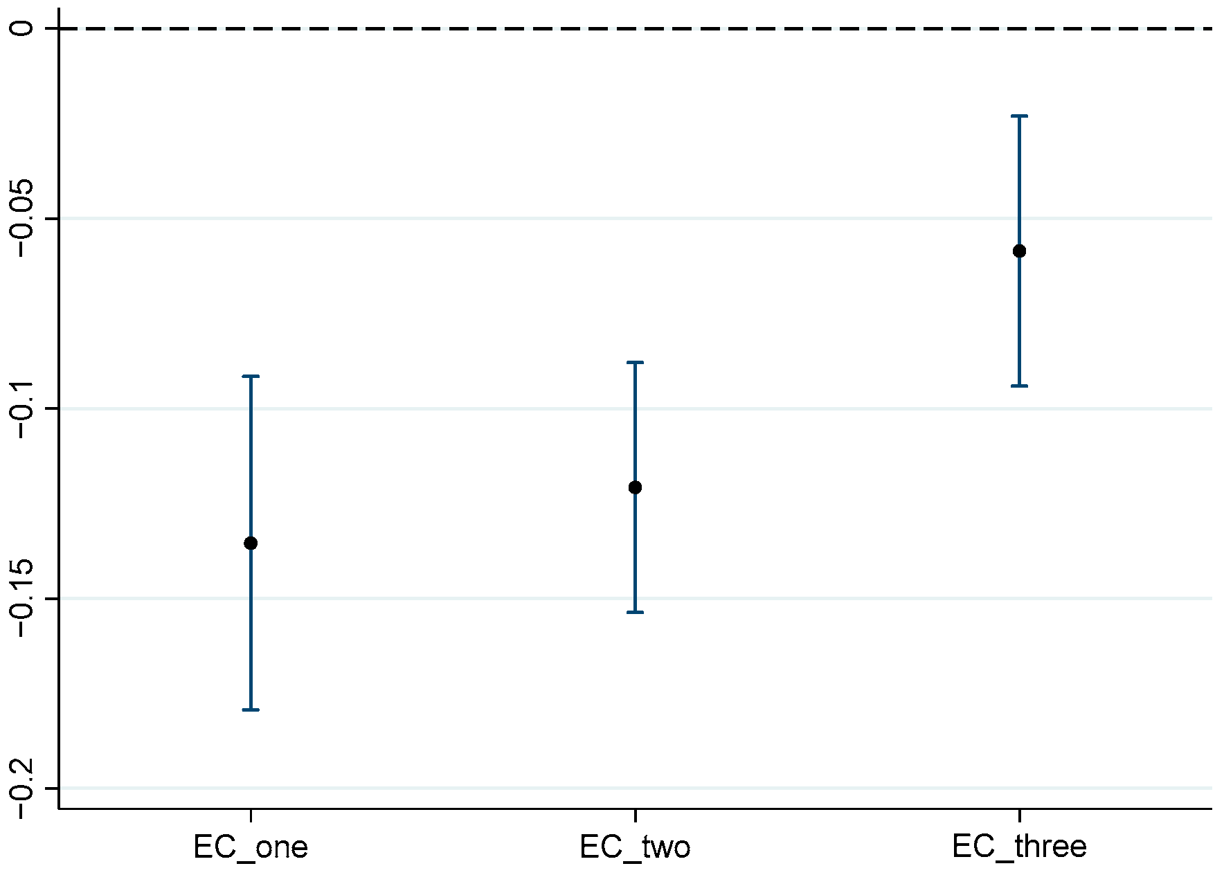 | EC | −0.091 *** (−4.28) | −0.063 ** (−1.96) | −0.009 (−0.21) | −0.047 (−1.29) |