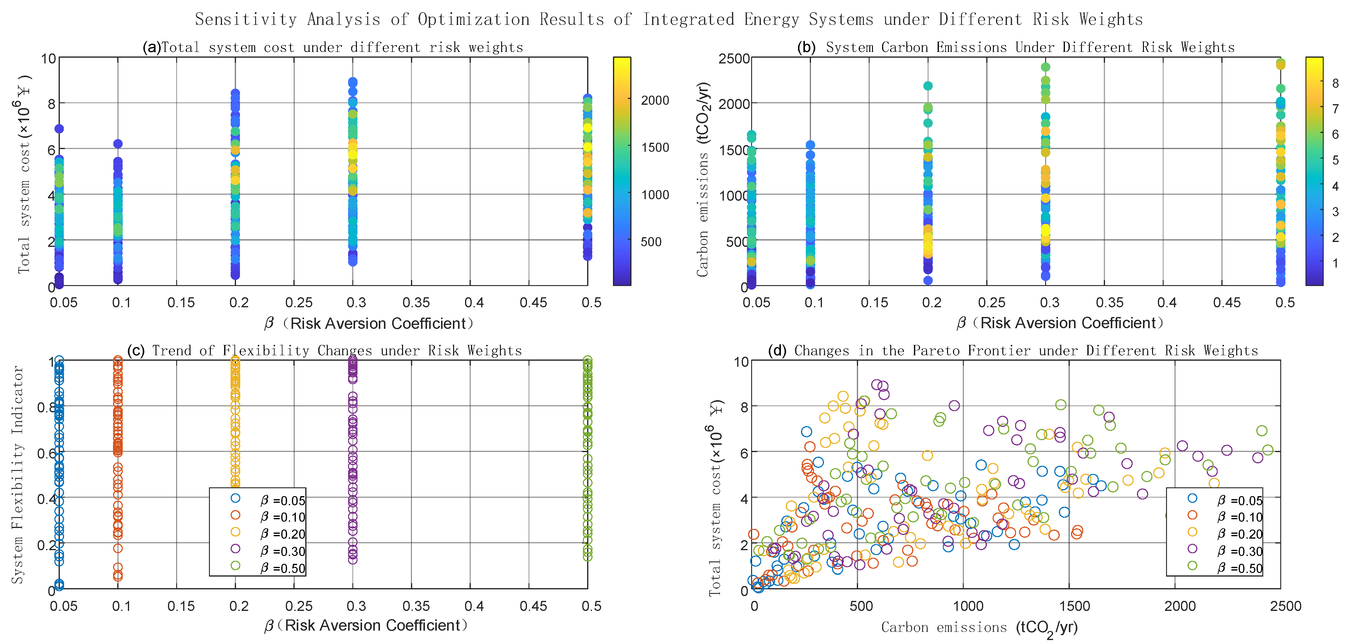 - The multi-objective Pareto frontier demonstrates explicit trade-offs among cost, emissions, and flexibility, providing quantitative guidance for carbon market policy design and integrated energy planning.