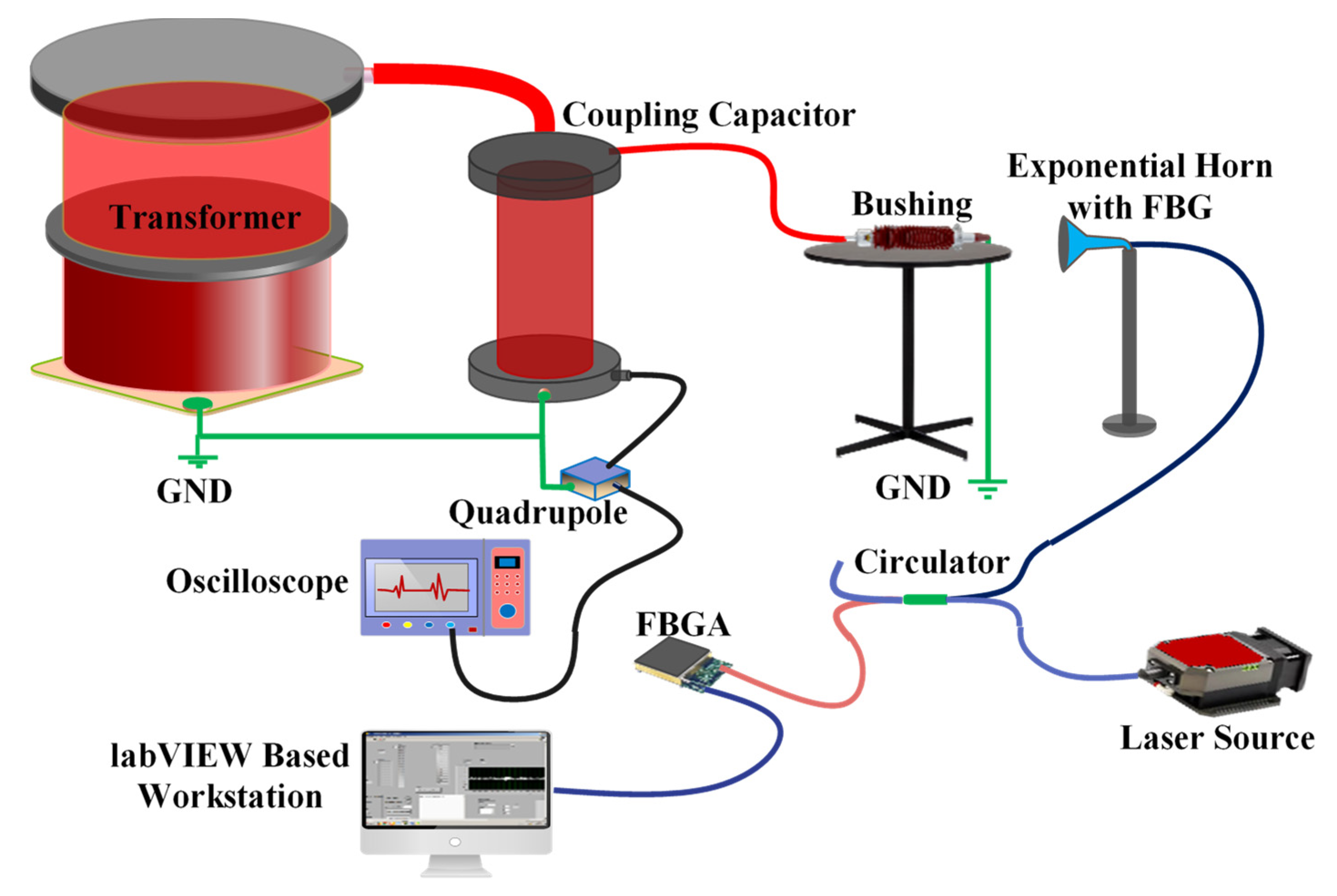 is the effective refractive index. In this study, the wavelength modulation due to temperature is neglected, as PD detection is performed under ambient conditions using a far-field acoustic sensing configuration. The FBG sensor is physically isolated from heat-generating, high-voltage components, making abrupt thermal transients at the sensor location unlikely. While ambient temperature variations may cause slow baseline drift in the Bragg wavelength, PD-induced acoustic signals produce rapid, high-frequency wavelength modulations at ultrasonic time scales. This inherent separation in temporal and spectral characteristics enables reliable discrimination between PD signals and thermal effects. Consequently, temperature variations do not affect PD detection accuracy under the present operating conditions, and established FBG temperature compensation methods may be incorporated for field deployment if required. Hence, in the proposed methodology, the change in the Bragg wavelength is entirely due to pressure induced by the PD-generated acoustic waves, which can be interrogated by a suitable fiber Bragg grating analyzer or optical spectrum analyzer, along with a LabVIEW-based data processing unit.