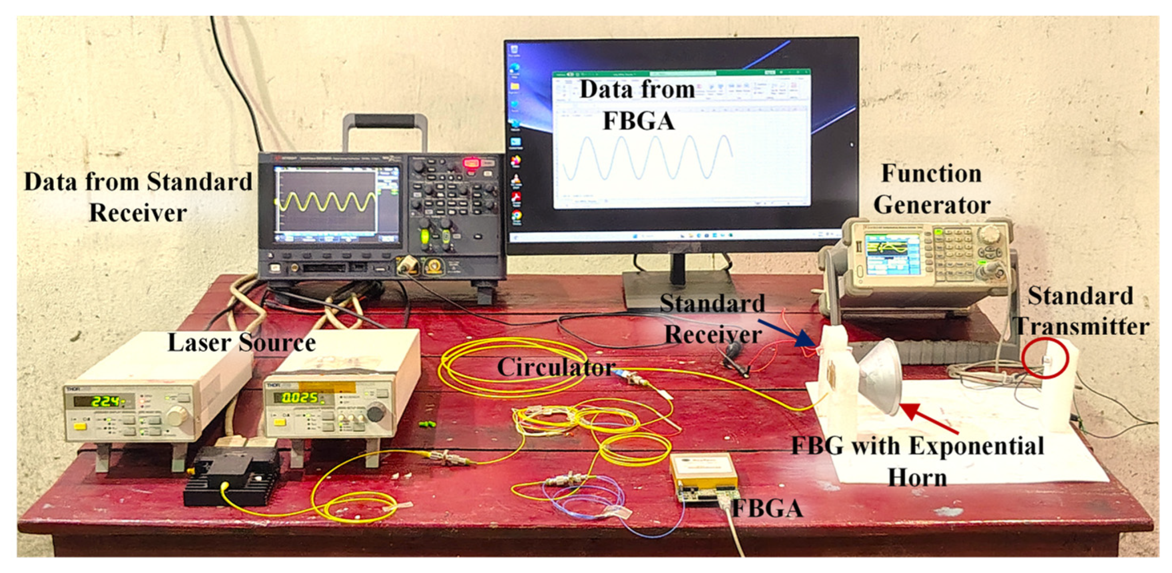 Figure 2. The distance between the standard transmitter and the FBG-based sensor with exponential horn was varied from 0.5 m to 2 m, and at each distance step, the sensor sensitivity was experimentally evaluated relative to the reference acoustic transmitter–receiver system at a selected operating frequency. The minimum detectable pressure was also identified with varying distance by progressively raising the excitation amplitude until the measured signal exceeded three times the standard deviation of the background noise.