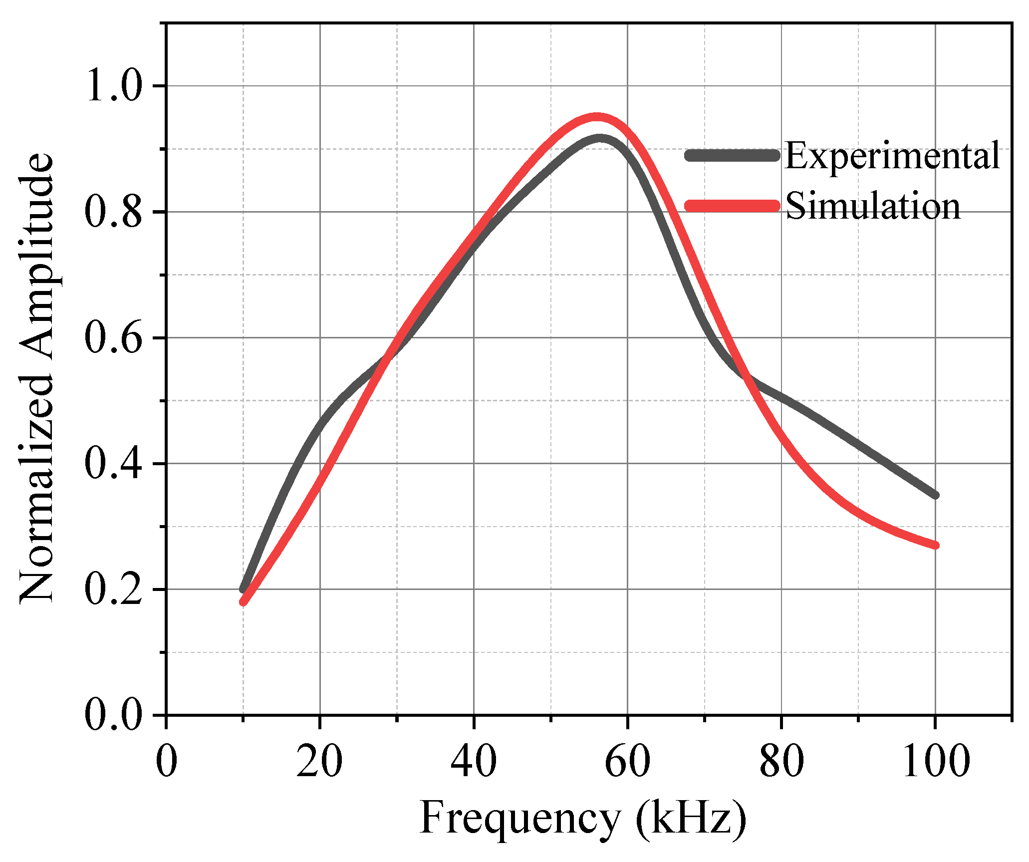 , offering wavelength-based description of its acoustic transfer characteristics. For a clear comparison with simulations, both the measured and simulated responses across the test frequencies were normalized to their respective maxima, producing standardized gain–frequency plots.