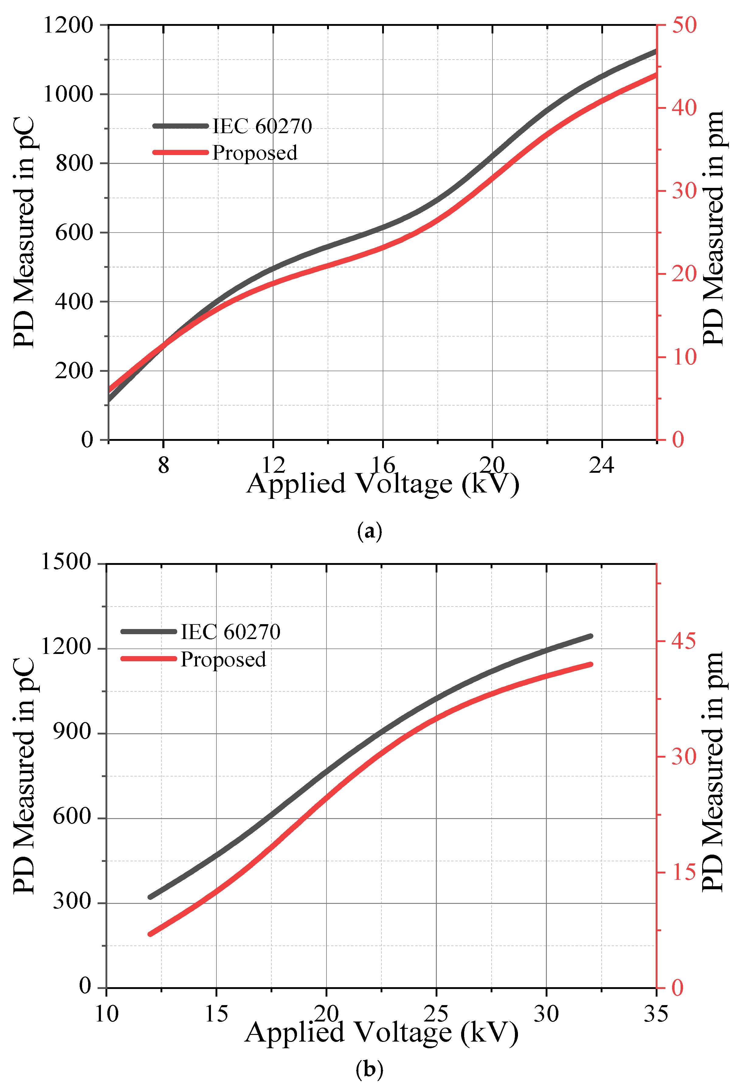 Figure 9 that the proposed method operates synchronously with the standard detection technique not only for different types of PD activities but also for a wider range of supply voltages, which establishes the linear consistency in the measurement of the proposed method. Although the two detection techniques for corona discharge detection are based on distinct measurement principles, they exhibit similar patterns in magnitude with increasing voltage, indicating that both systems possess a strong sensitivity to weak ionization activity. A similar pattern is observed for surface discharge, where both methods exhibit a steeper increase in PD events with increasing voltage. This suggests that the proposed method can identify various PD event types with a detection capability comparable to that of the standard method.