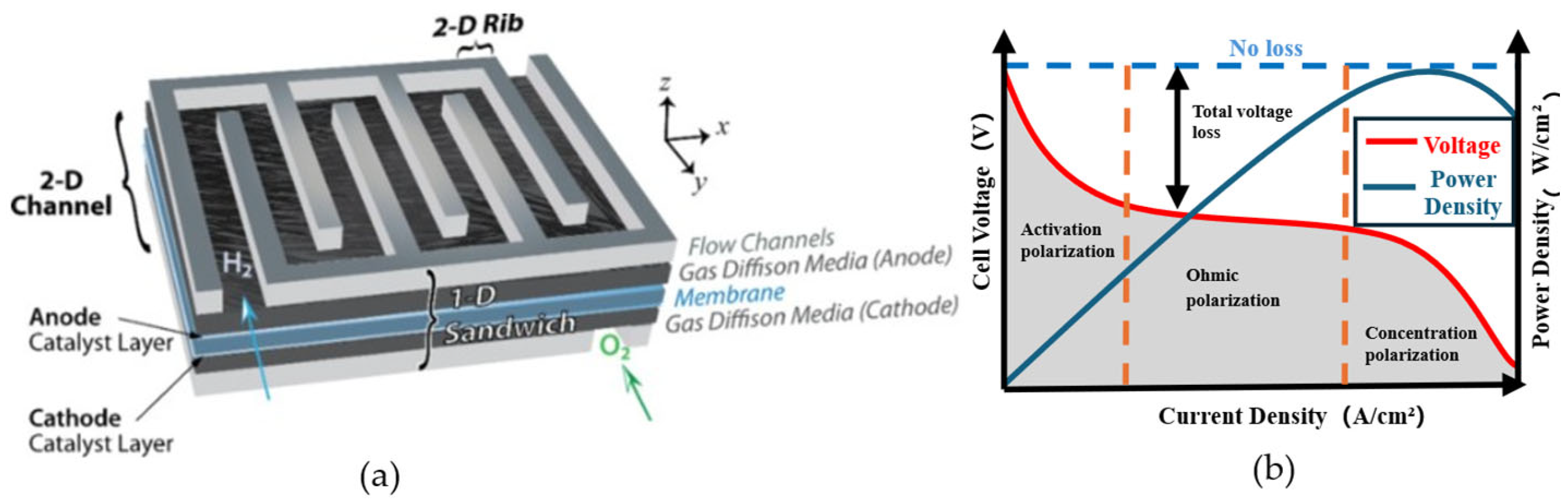 | 1-D [13,14] | One spatial direction | Reaction and transport in MEA/porous media; Charge transfer | Through-plane; Along-channel |