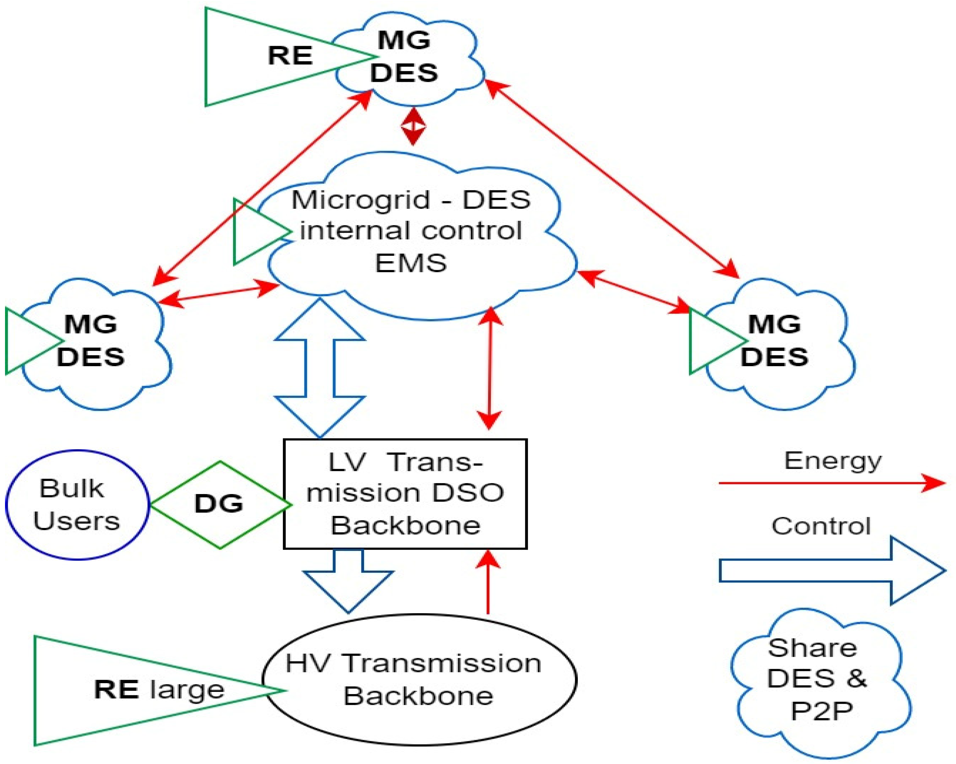 - Recognition of the socio-technical character of electricity grids, requiring transformation of their organizational model to interconnect DES beyond hierarchical control.