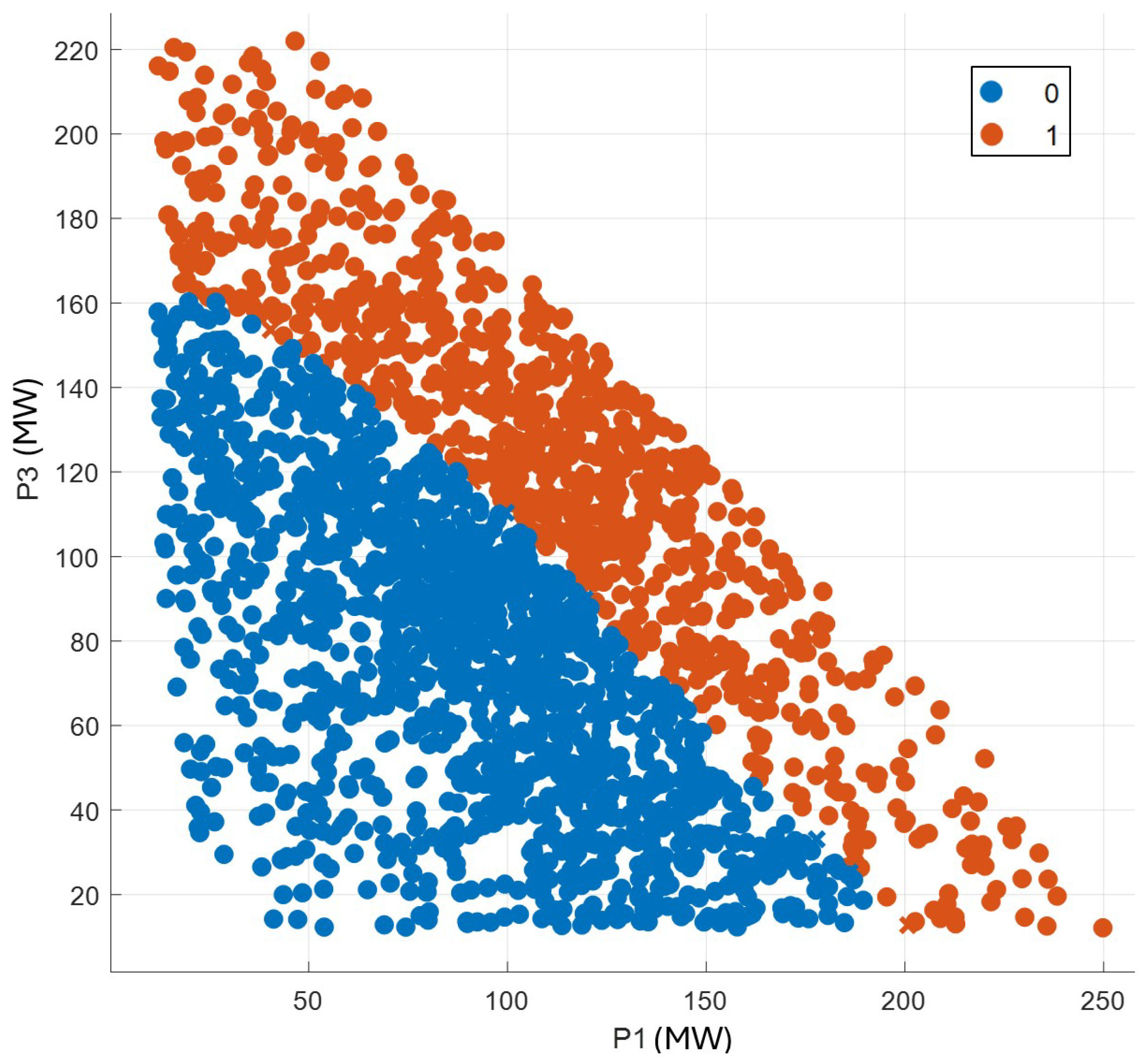 Figure 8 explores the interaction between Generators G1 and G3. The dominance of orange points at mid to high power ranges (100–150 MW for G1 and 80–180 MW for G3) suggests that these dispatch levels are optimal for enhancing frequency-nadir performance when the BESS is retained at Bus 5.