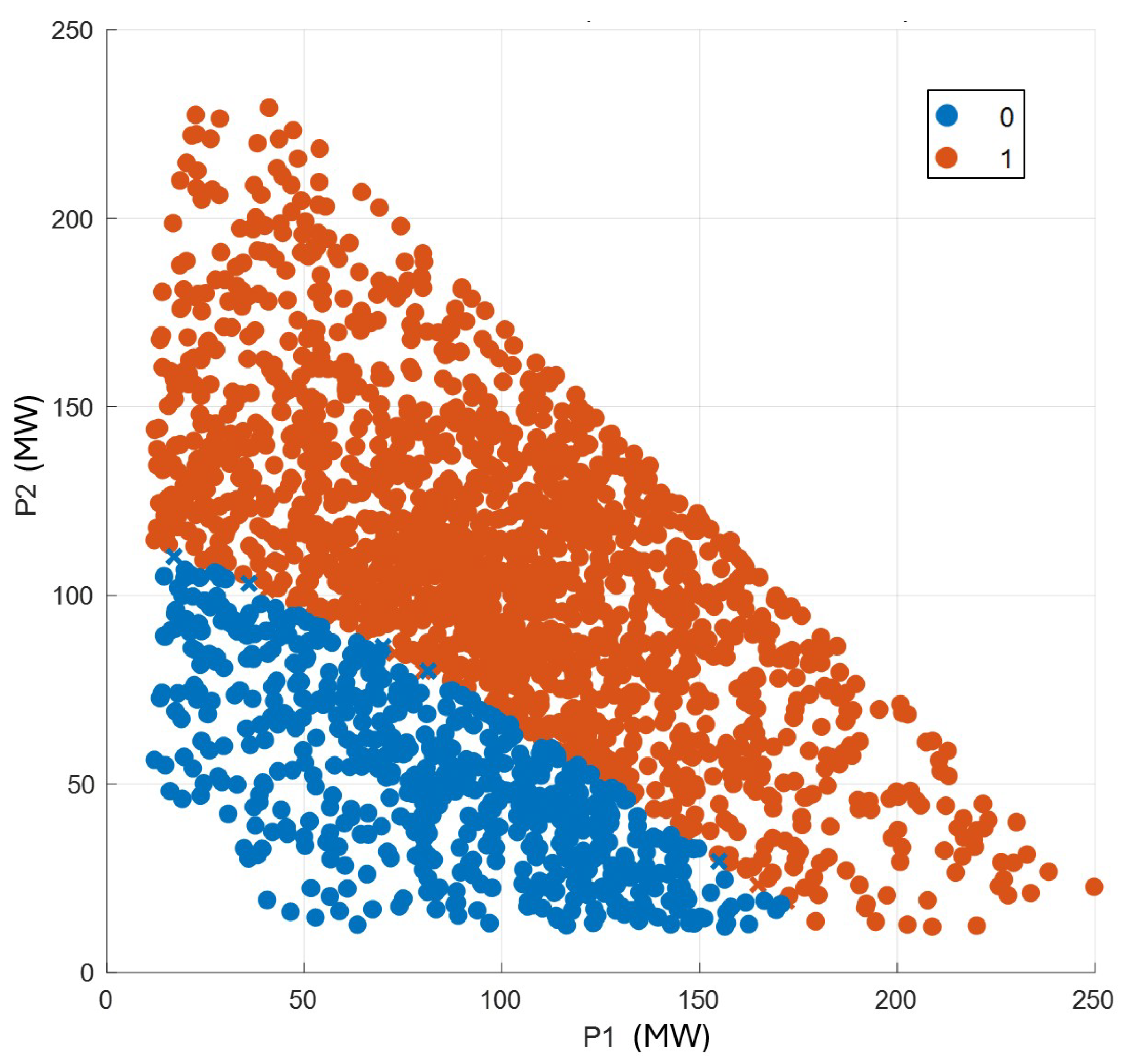 Figure 13, the clustering of orange dots in the mid- to high-range outputs of G1 and G2 suggests that higher outputs lead to better frequency-nadir management with the BESS at Bus 5. Conversely, blue dots concentrated in lower output ranges indicate that at lower power outputs, the BESS might be more effective at Bus 2.