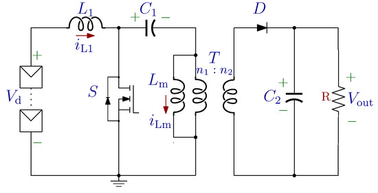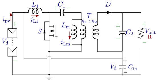 PV systems are typically interfaced with downstream power stages or the grid through multiple power conversion stages, including a DC–DC converter that regulates and adapts the voltage generated by the PV panels [5,6,7]. This stage is particularly critical because PV panels inherently produce relatively low output voltages, which must be efficiently boosted to meet grid or load requirements. Therefore, a wide range of converter topologies has been extensively developed and comparatively analyzed in the literature.
