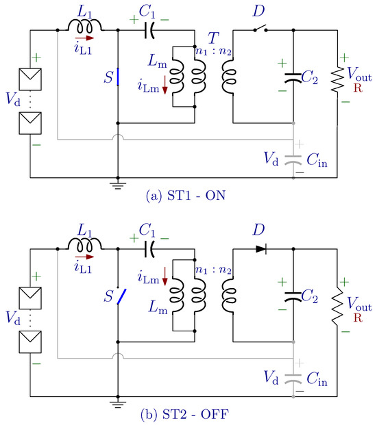 When the switch is turned OFF, the stored energy in and is simultaneously released and transferred to the output stage through the forward-biased diode. During this interval, the magnetic coupling element effectively contributes to voltage adaptation according to the transformer turns ratio, thereby modulating the output voltage level. The output capacitor is recharged while supplying the load, ensuring voltage continuity and reduced ripple. Meanwhile, capacitor is naturally recharged, preparing the converter for the subsequent switching cycle. The combined mechanism of direct and magnetically coupled energy transfer limits the fraction of total power processed by the active switching device, which constitutes the fundamental principle of PPP. Figure 4 illustrates both switching states.
