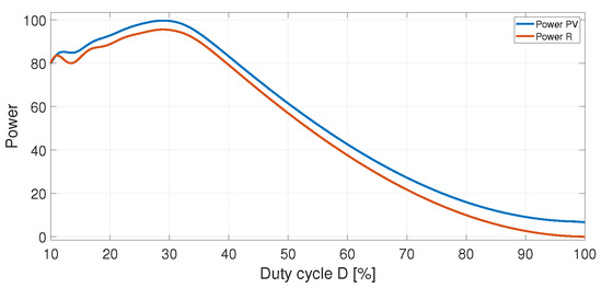 Simulation results (FPP-SEPIC): input (PV) and output (R) power versus duty cycle.