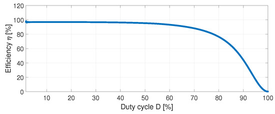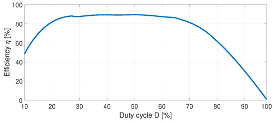 Simulated efficiency of the FPP-SEPIC converter as a function of the duty cycle.