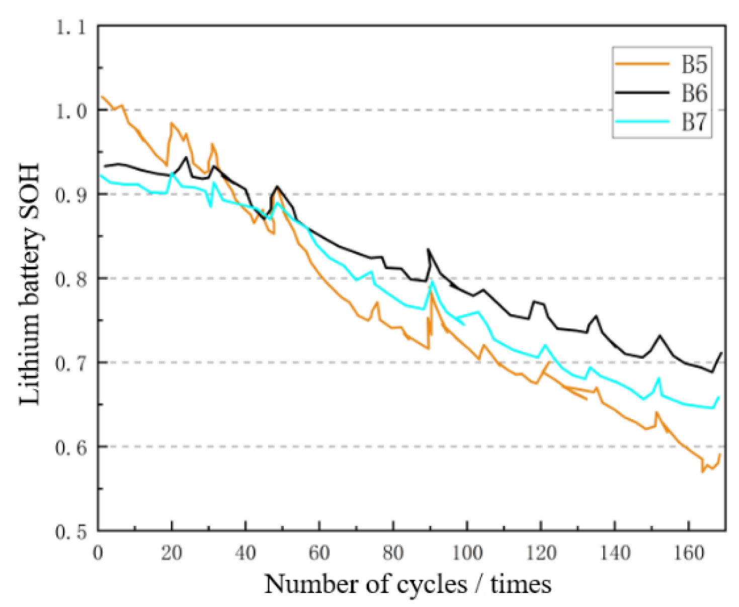 - Model Evaluation and Validation: Using the trained SSA-BiLSTM model, the test sets of batteries B5, B6, and B7 were used for SOH prediction. The output results of the model were compared with the actual SOH values, and the prediction errors were calculated to verify the prediction accuracy and generalization ability of the model.