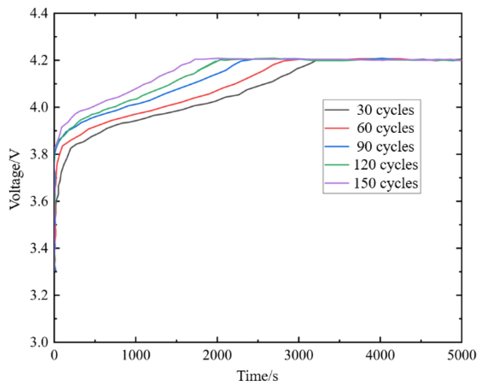- The voltage rise rate in the constant current charging stage increases with the increase in the number of cycles.