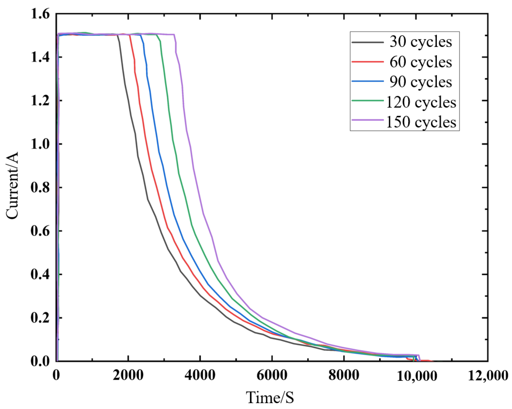 - When the constant voltage charging time is prolonged, the curve shows a left-shifting trend.