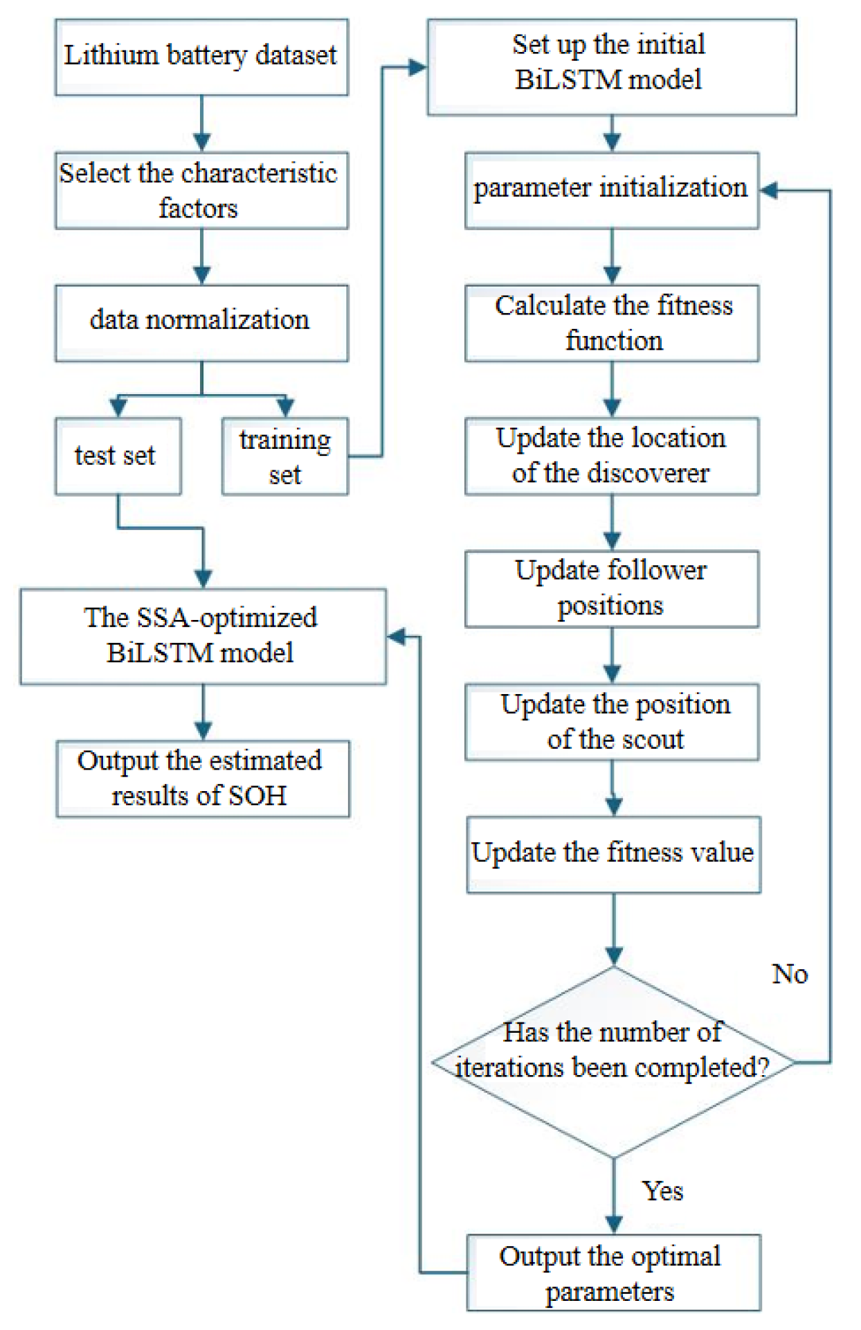 - Hyperparameter optimization and model training: The SSA algorithm is used to optimize some hyperparameters of the BiLSTM model to enhance its fitting ability and generalization performance. Subsequently, the SSA-BiLSTM model is trained based on the training dataset to obtain the optimal model for SOH prediction.