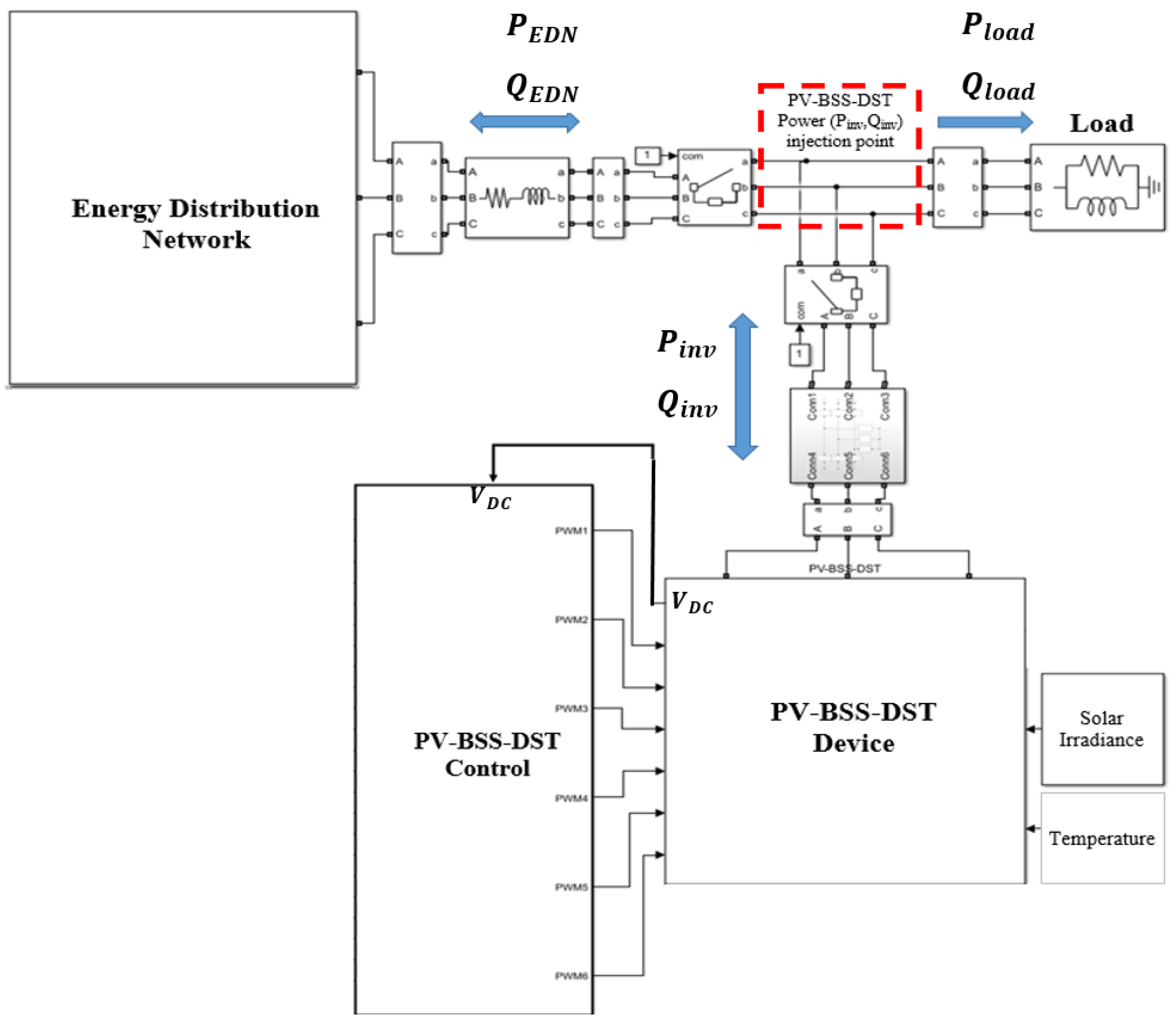 Figure 8 illustrates the effect of applying the proposed DM-PWM control on voltage drop and active and reactive power losses in the test EDN. The base (uncompensated) case is simulated using the same network model under EV loading conditions with the PV-BSS-DST disconnected (i.e.,