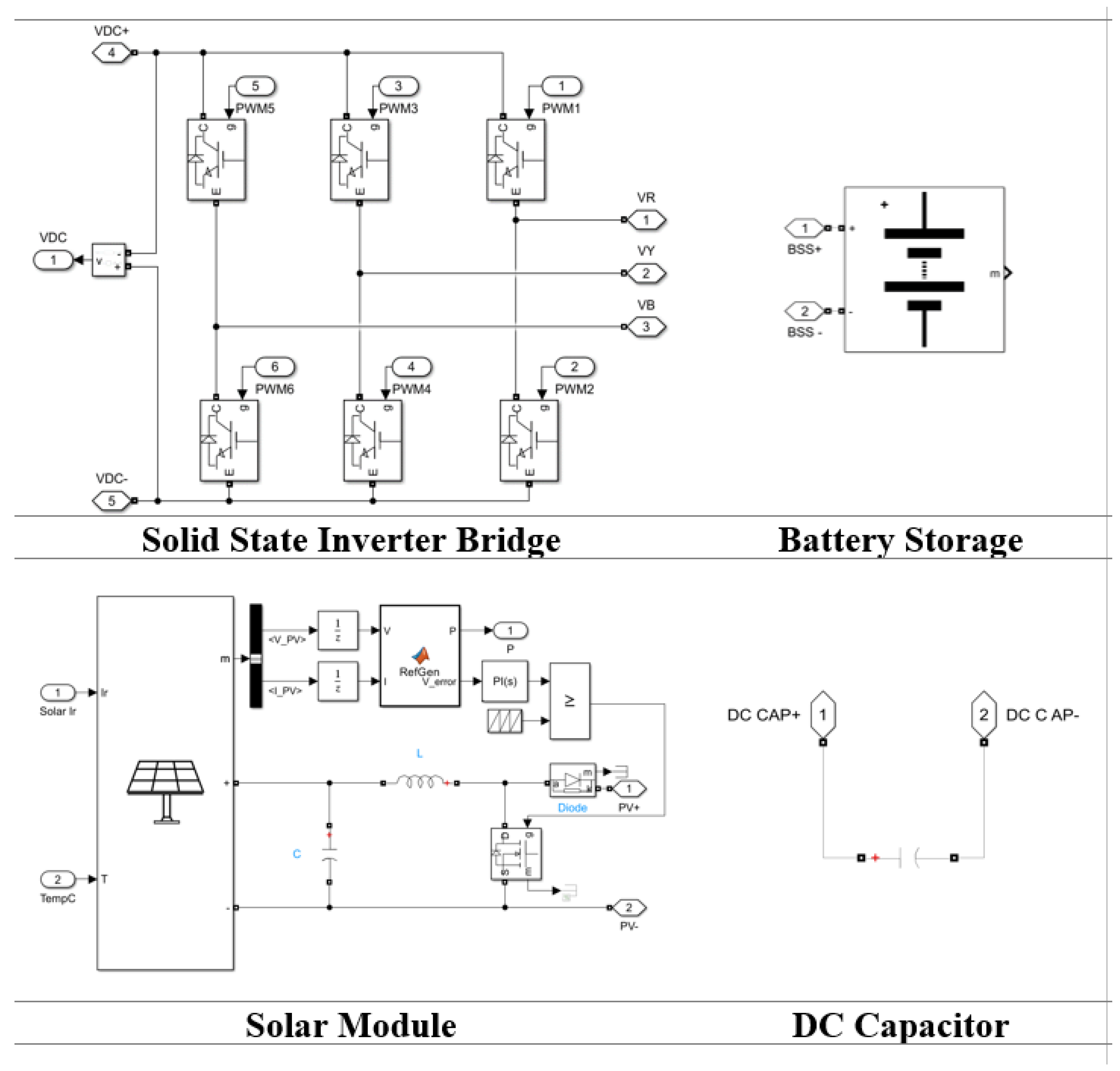 The PV-BSS-DST integrates the PV source, battery storage system, DC link capacitor, and a three-phase voltage source inverter operating as a DSTATCOM (or DST), all interfaced through a common DC bus. According to