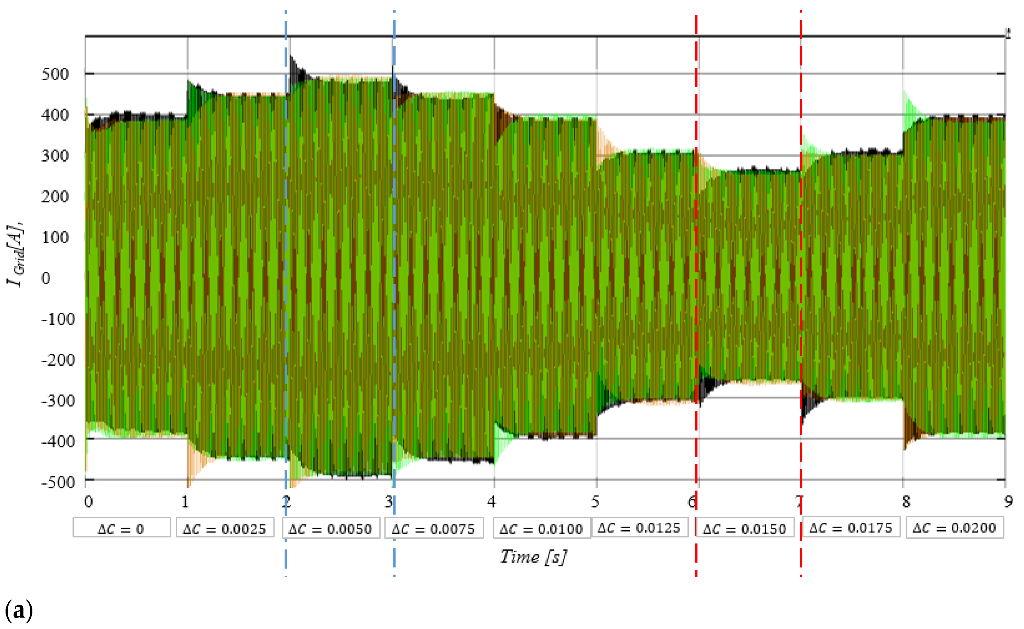 The power quality performance is evaluated using the FFT analysis, which illustrates that the voltage THD remains low at approximately 0.22% for ΔC = 0.015 s, well below the IEEE 519 limits.