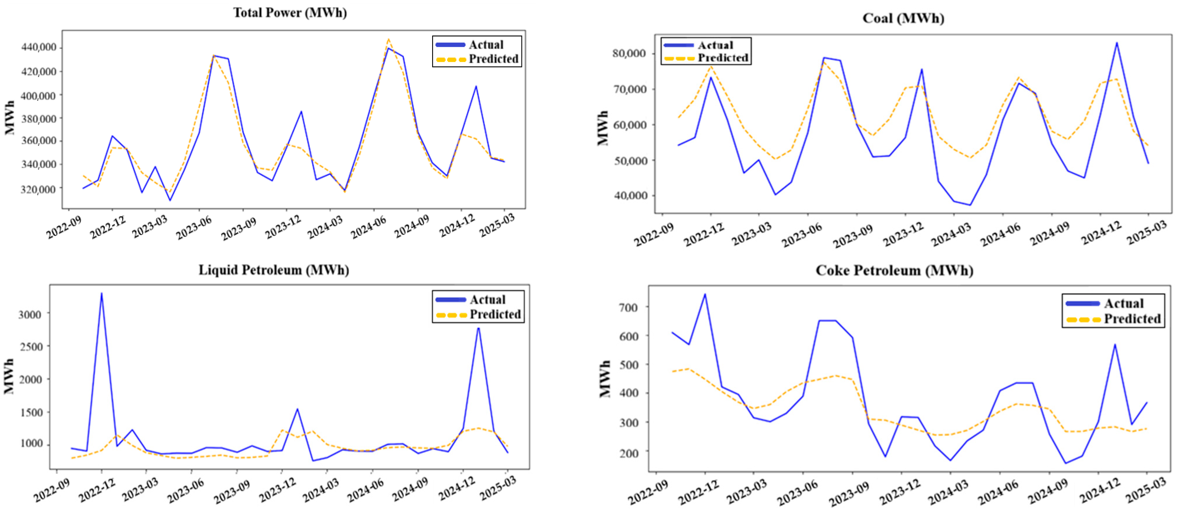 | Coke Petroleum | Bi-LSTM | Lowest RMSE (108 MWh) and MAE (85 MWh) |