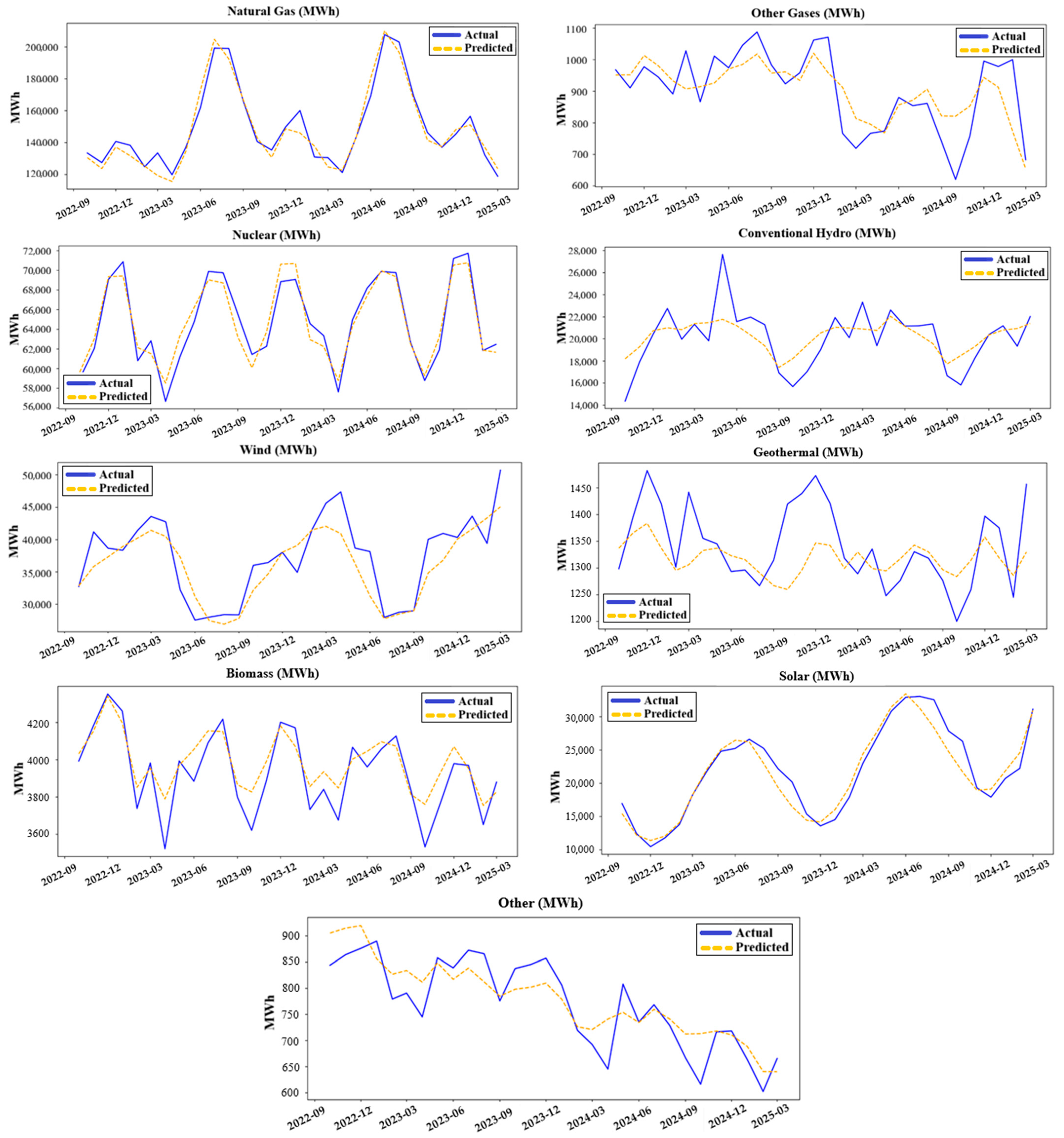 - Step 5: Forecasting—the trained framework is used to forecast power generation for each energy source. The output forecasts are evaluated again using MAPE, MAE, and MSE to ensure the reliability and accuracy of the model. This step validates the effectiveness of the overall forecasting approach and demonstrates the benefits of using specialized models for different sources within a unified framework.