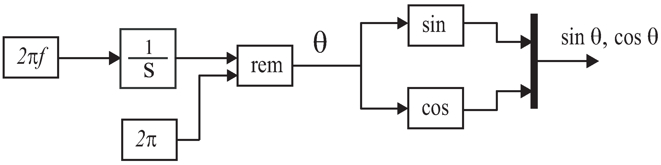Generating the system’s electrical angle is an essential element in the GFM control strategy, since synchronisation is not based on the electrical grid, but rather built internally from the frequency generated by the controller itself. This approach allows the converter to establish its own phase reference, replicating the behaviour of a stand-alone synchronous generator. The process of generating the angle begins with the calculation of the electrical angular velocity